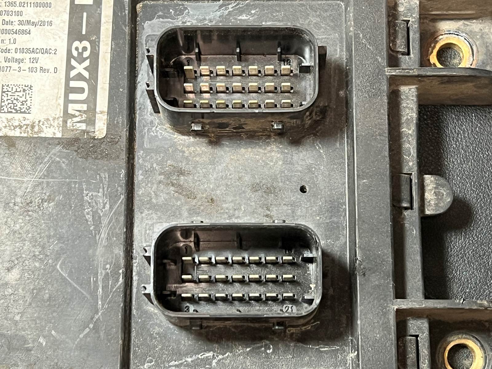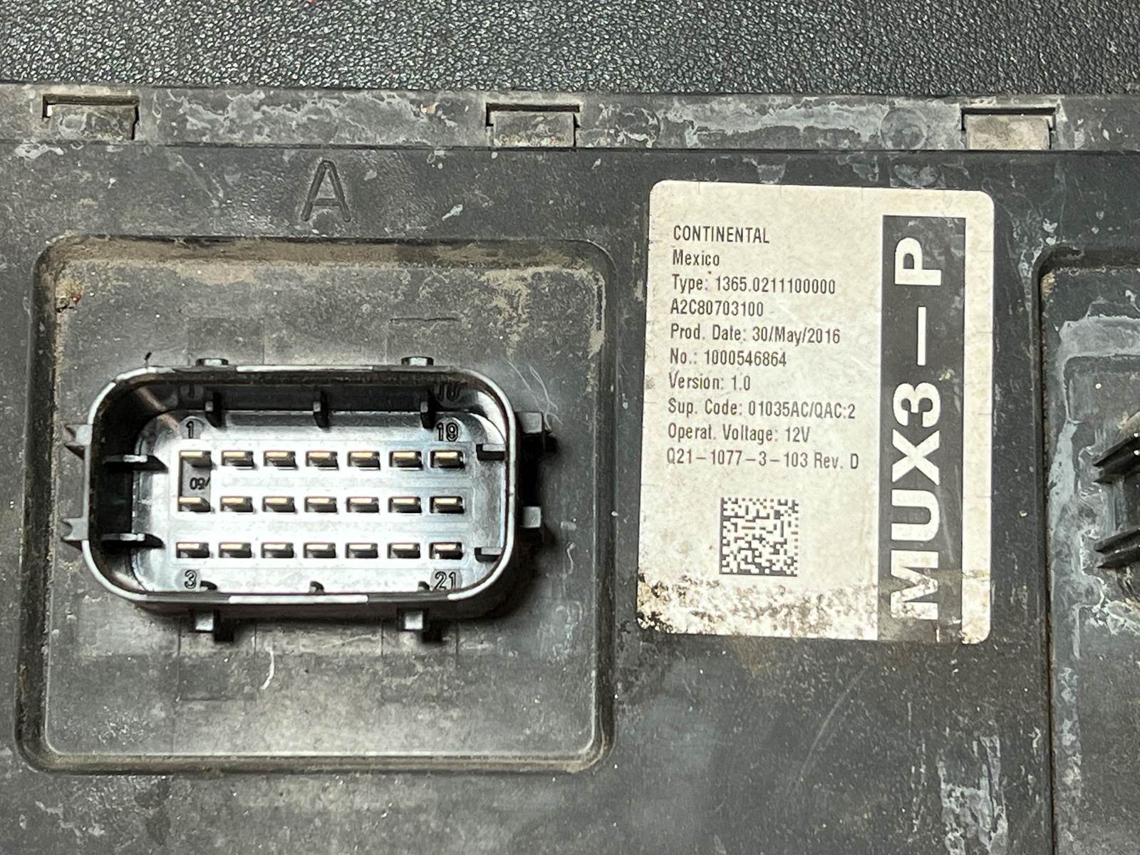 (GOOD USED) 2016 Cummins ISX12 Chassis Control Module Q21-1077-3-103 REV. D For Sale, 12V, Part # Q21 1077 3 103 REV. D, Q2110773103REVD, Other Part # MUX3-P, MUX3 P, MUX3P, Type: 1365.0211100000, A2C80703100, SUP. Code: 01035AC/QAC:2, 2 Rectangular 21 Pin Plugs, Stock # 9690