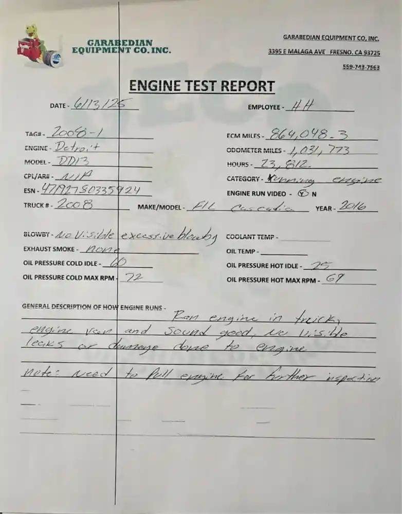 DD13 EPA 10 GHG14, 410 HP, S/N 471927S0335924, 1,031,773 Odometer Miles. Engine runs good. (see video of engine running and test report)