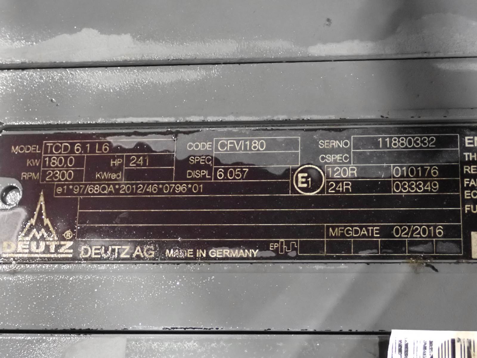 2016 Deutz TCD6.1 L6 diesel engine, turbocharged, aftercooled, 241 HP at 2300 RPM rating, tier 4 emissions, complete as pictured. TEST RAN CLEAN, NO SMOKE OR BLOWBY OBSERVED DURING COLD TEST RUN, HELD GOOD OIL PRESSURE AT IDLE & MID THROTTLE.