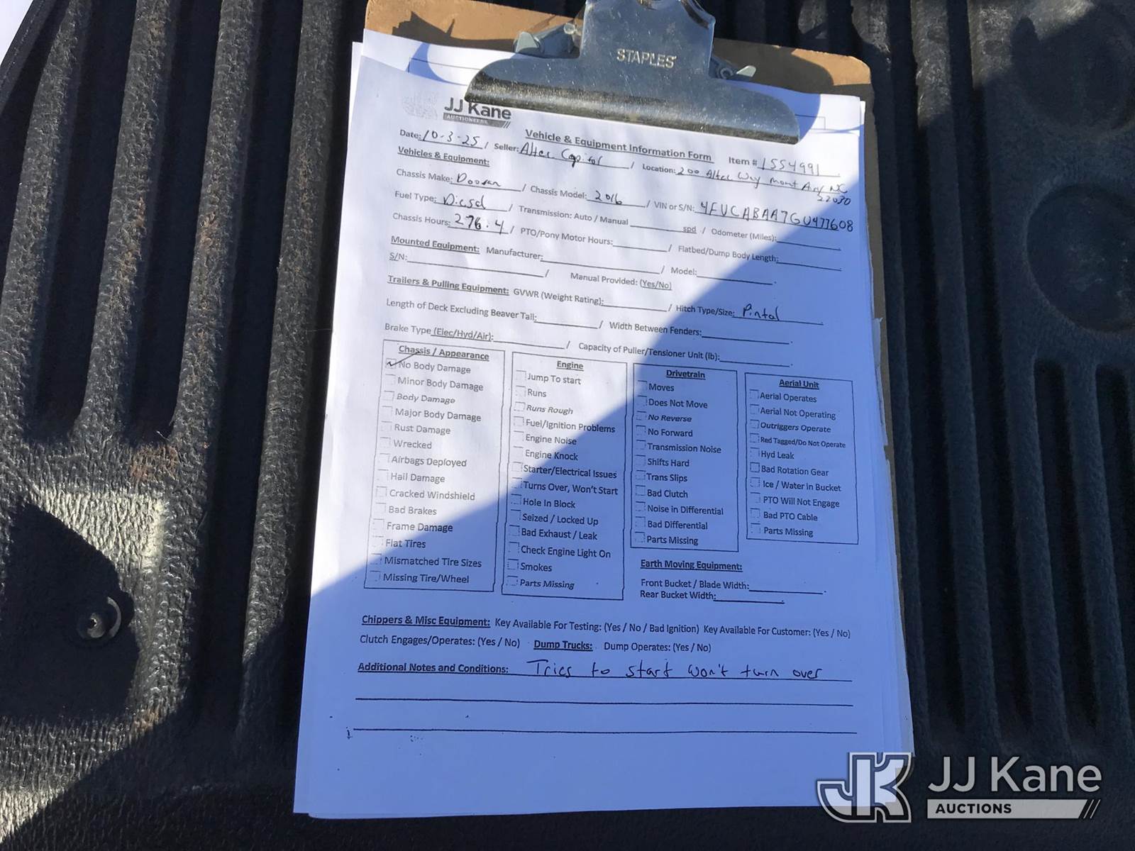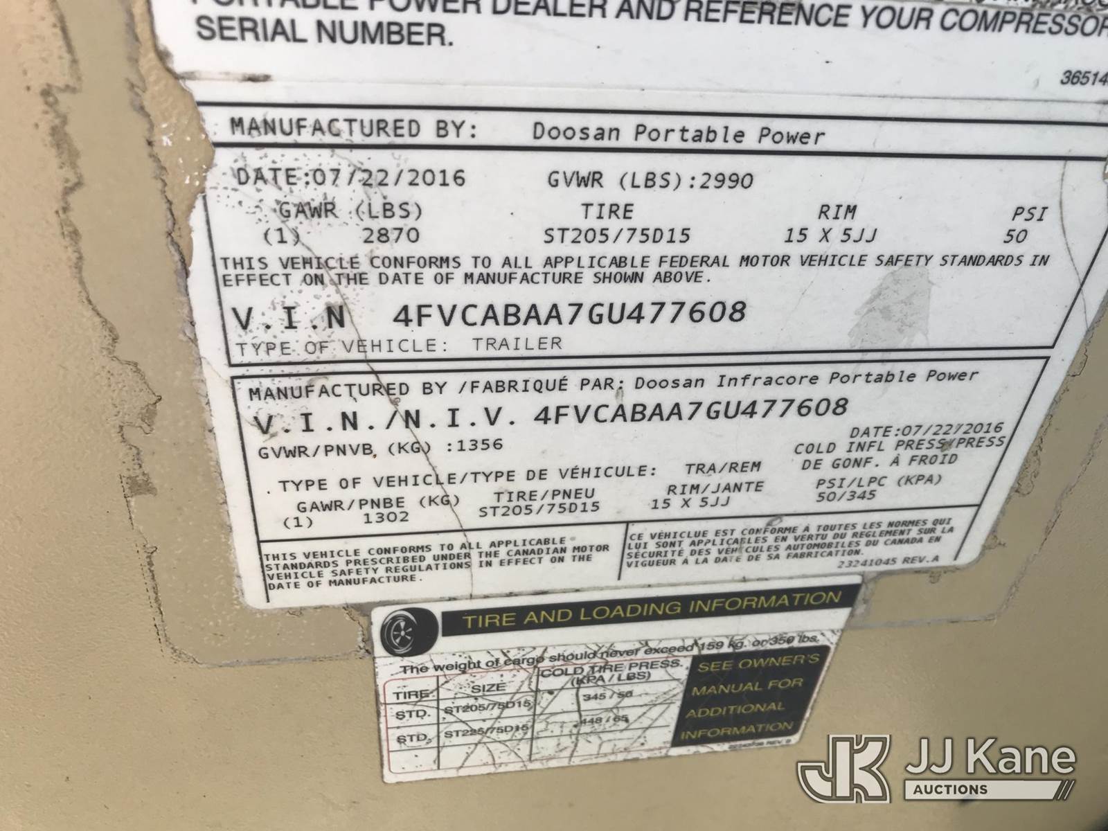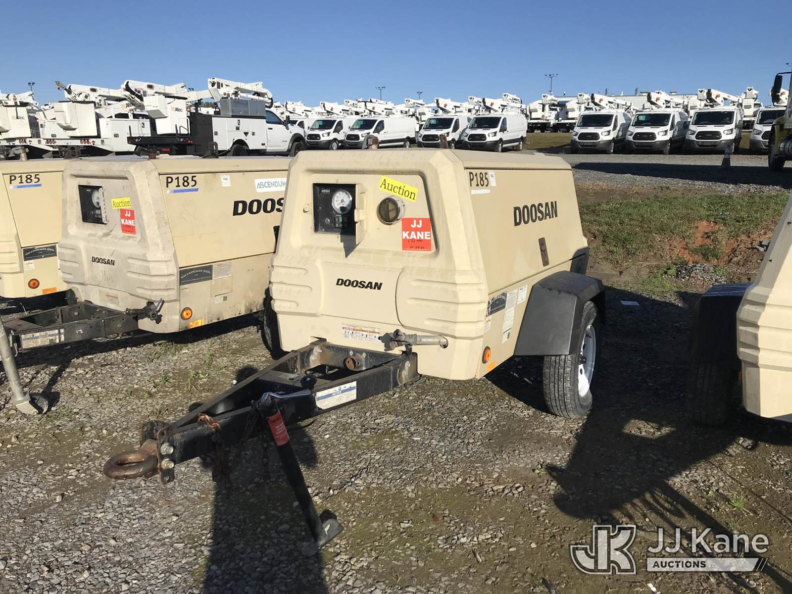 2016 DOOSAN P185WDZ-T4F Portable Air Compressor, diesel, (Not Running, Condition Unknown) (Reads 276 hours) This is a Titled Item NOTE: This unit is being sold AS IS/WHERE IS via Timed Auction and is located in Mount Airy, NC. For more information & removal arrangements please contact Jim Carpenter @ 980-392-7918. (Buyer is responsible for removal. Assistance by consignor or JJ Kane Auctioneers is not assured.)