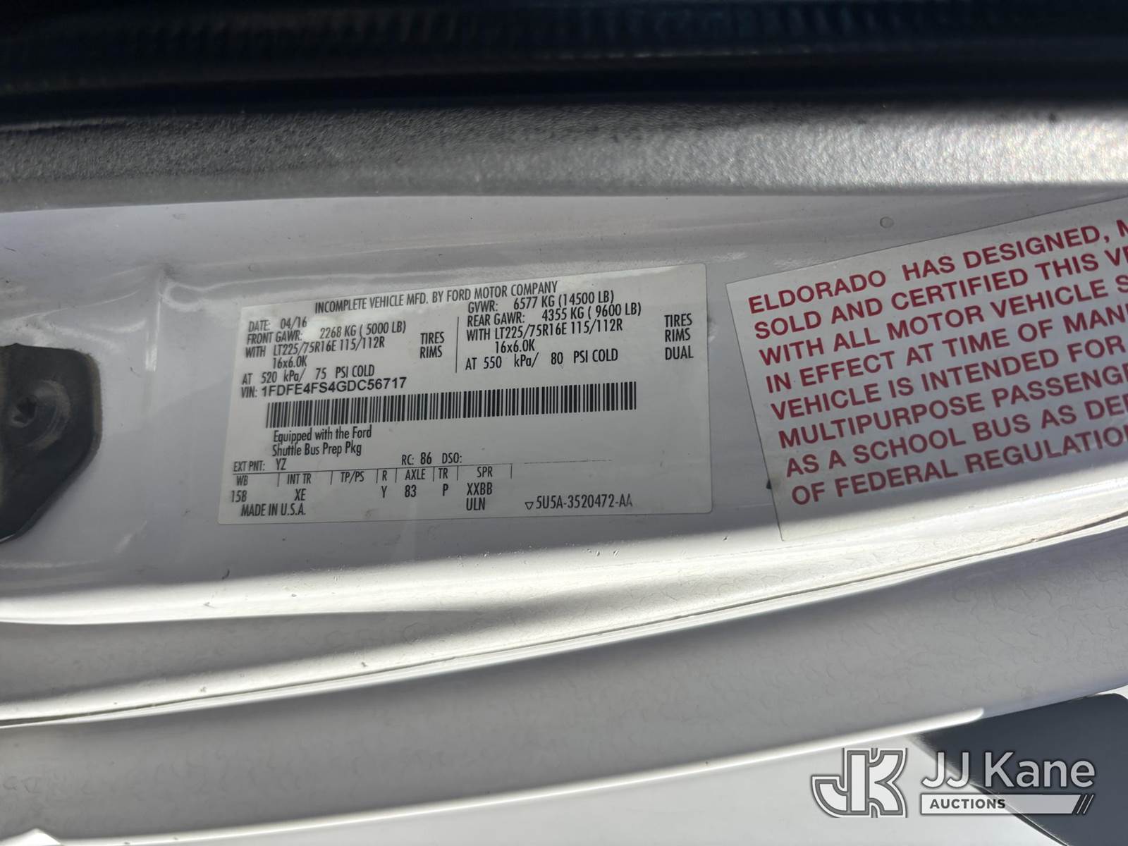 2016 Ford E 450 s/n 1FDFE4FS4GDC56717, V10 Auto, 2wd, CNG Only, A/C, True Mileage Unknown (CNG) This is a Titled Item NOTE: This unit is being sold AS IS/WHERE IS via Timed Auction and is located in Jurupa Valley, CA. Inspection & preview days for this unit are the 2 business days prior to the first day of items closing for this auction, item is located at 4510 Muth Way Jurupa Valley, CA 92509 and hours of operations are 8a-4p. For pre-sale questions, please contact please contact Office Staff @ (310) 353-7140. Dealer License Number 45696. (Buyer is responsible for removal. Assistance by consignor or JJ Kane Auctions is not assured.)