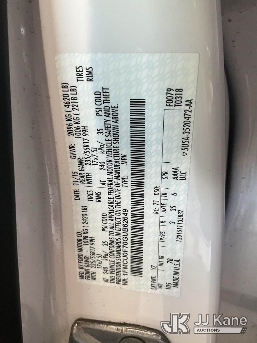 2016 Ford Escape 4-Door Sport Utility Vehicle, 4-cyl gas, 6-Speed Automatic, A/C, (157,283 miles) (Runs & Moves) This is a Titled Item NOTE: This unit is being sold AS IS/WHERE IS via Timed Auction and is located in Jurupa Valley, CA. Inspection & preview days for this unit are the 2 business days prior to the first day of items closing for this auction, item is located at 4510 Muth Way Jurupa Valley, CA 92509 and hours of operations are 8a-4p. For pre-sale questions, please contact please contact Office Staff @ (310) 353-7140. Dealer License Number 45696. (Buyer is responsible for removal. Assistance by consignor or JJ Kane Auctioneers is not assured.)