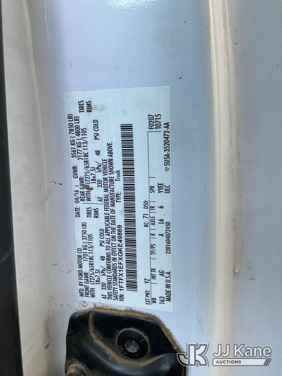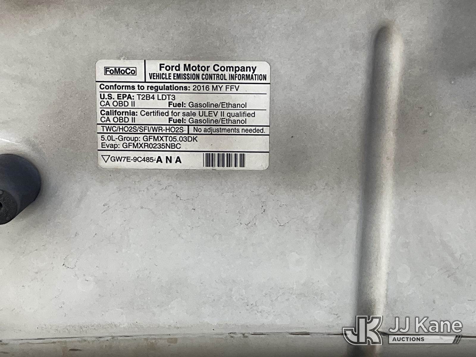 2016 Ford F-150 Extended-Cab Pickup Truck, 5.0L V8 6-Speed Automatic, 4WD, GAS, A/C, with tow package, tool boxes, (136,765 miles) (Runs & Moves) This is a Titled Item NOTE: This unit is being sold AS IS/WHERE IS via Timed Auction and is located in Jurupa Valley, CA. Inspection & preview days for this unit are the 2 business days prior to the first day of items closing for this auction, item is located at 4510 Muth Way Jurupa Valley, CA 92509 and hours of operations are 8a-4p. For pre-sale questions, please contact please contact Office Staff @ (310) 353-7140. Dealer License Number 45696. (Buyer is responsible for removal. Assistance by consignor or JJ Kane Auctioneers is not assured.)