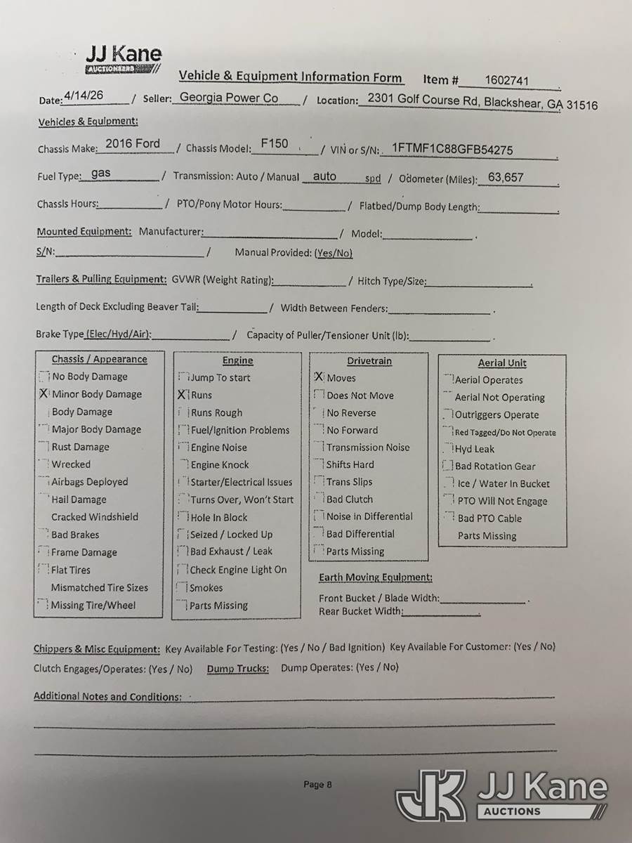 2016 Ford F-150 Pickup Truck, 6-cyl gas, RWD, Auto, A/C, (63,656 miles) (Runs & Moves) This is a Titled Item NOTE: This unit is being sold AS IS/WHERE IS via Timed Auction and is located in Blackshear, GA. Inspection & preview days for this unit are by appointment only; please contact us at contact@jjkane.com or 84-Go-JJKane for more details. (Buyer is responsible for removal. Assistance by consignor or JJ Kane Auctions is not assured.)