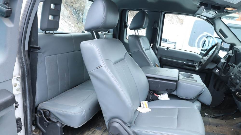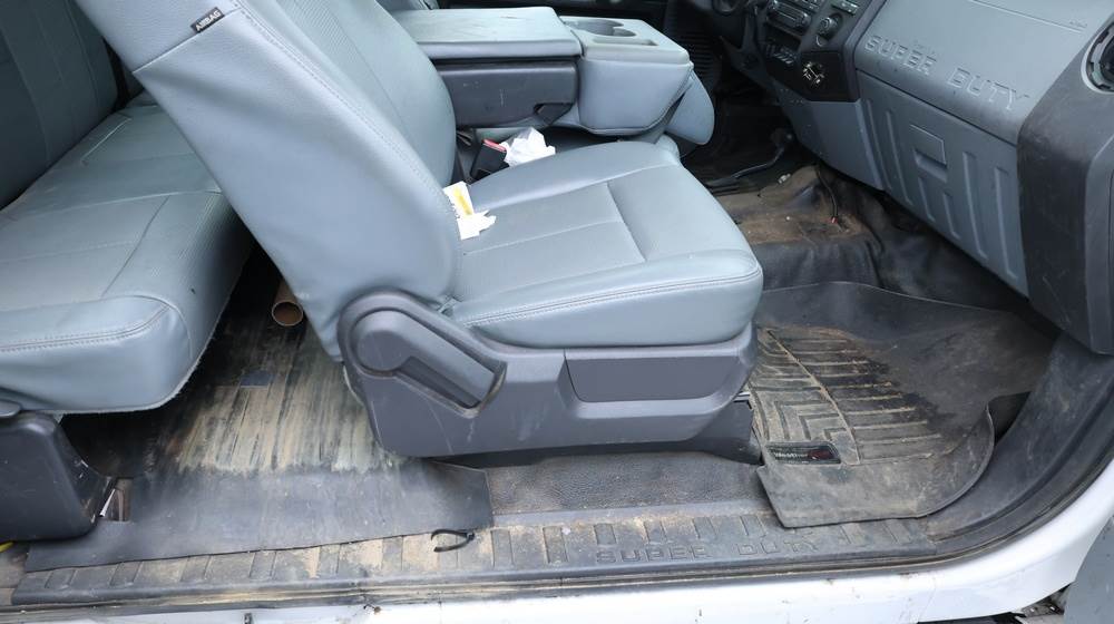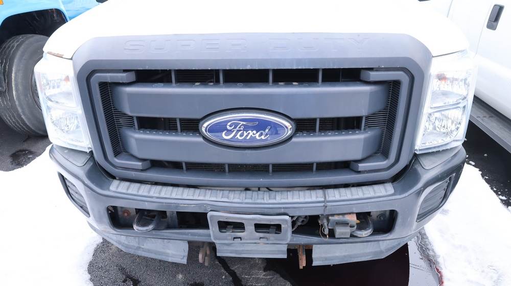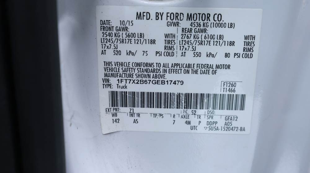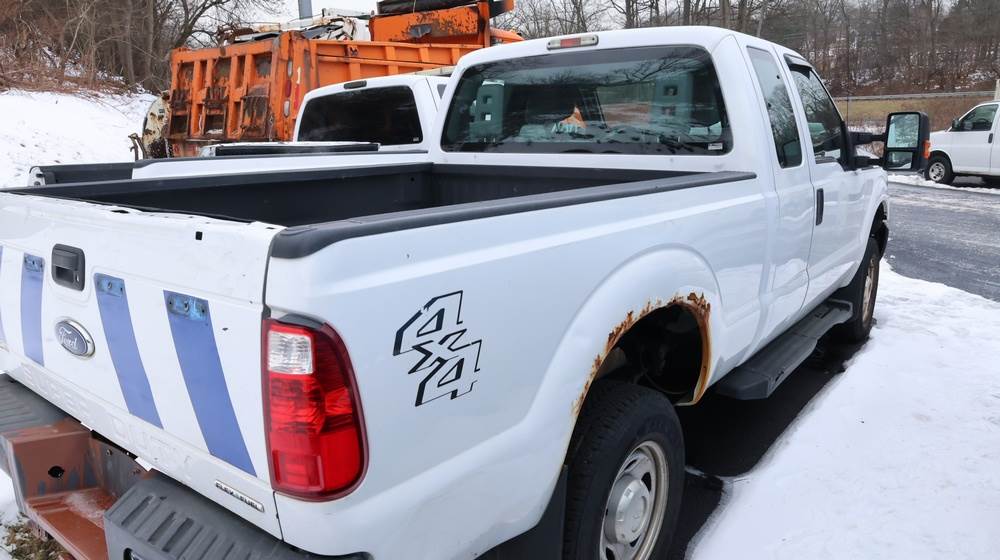 2016 Ford F-250 Super Duty XLT 4WD pickup with a 6.2L V8 OHV gasoline engine. VIN: 1FT7X2B67GEB17479. Odometer reading: 93,083.1 miles. White exterior with steel wheels and 4x4 badging. Equipped with an extended cab configuration and standard pickup bed. Exterior features include black grille, front tow hooks, trailer hitch, and side step rails. Interior includes vinyl flooring, front bench seating with fold-down center console, factory radio, HVAC controls, steering wheel–mounted controls, automatic transmission selector, and power accessories. Seller reports Rusty, Runs poor, runs and drives, title and key available. Must be towed.