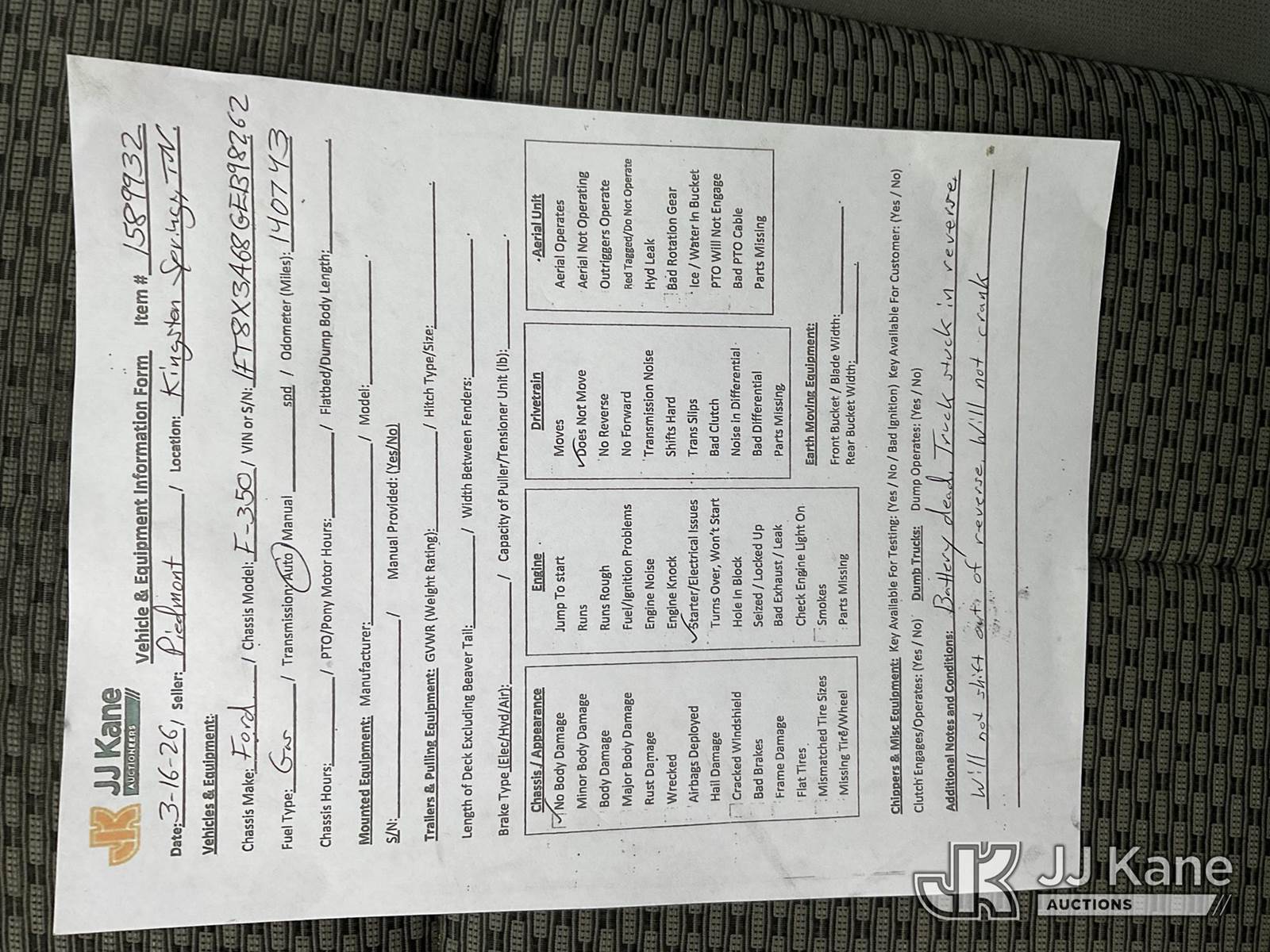 2016 Ford F-350 SD Extended-Cab Service Truck, 6.2L V8 OHV 16V RWD, GAS, Auto, A/C, (140,743 miles) (Not Running, Condition Unknown) (Electrical Issues) This is a Titled Item NOTE: This unit is being sold AS IS/WHERE IS via Timed Auction and is located in Kingston Springs, TN. Inspection & preview days for this unit are by appointment only; please contact us at contact@jjkane.com or 84-Go-JJKane for more details. (Buyer is responsible for removal. Assistance by consignor or JJ Kane Auctions is not assured.)