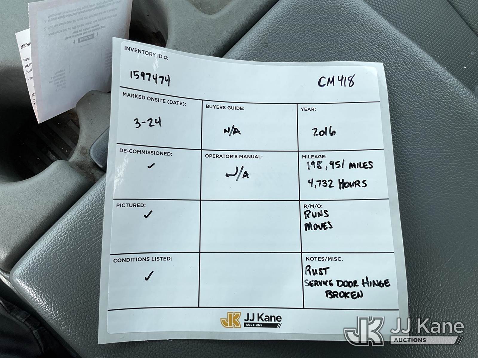 2016 Ford F-350 SD Extended-Cab Service Truck, 6.2L V8 OHV 16V Gas, Auto, A/C, (198,951 miles) (Runs & Moves) (Rust, Service Door Hinge Broken) (Reads 4,732 hours) This is a Titled Item NOTE: This unit is being sold AS IS/WHERE IS via Timed Auction and is located in Charlotte, MI. Inspection & preview days for this unit are the 2 business days prior to the first day of items closing for this auction, item is located at 750 Island Hwy Charlotte, MI 48813 and hours of operations are 8a-4p. For pre-sale questions, please contact Corey Cook at (517) 983-0796 or corey.cook@jjkane.com (Buyer is responsible for removal. Assistance by consignor or JJ Kane Auctions is not assured.)