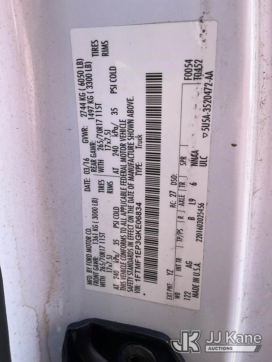 2016 Ford F150 4x4 Pickup Truck, 6-cyl gas, Auto, A/C, (93,440 miles) (Duke Unit) (Runs & Moves) (Check Engine Light On, Paint Damage) This is a Titled Item NOTE: This unit is being sold AS IS/WHERE IS via Timed Auction and is located in Ocala, FL. For more information & removal arrangements please contact Mike Lessard @ 352-629-6677. (Buyer is responsible for removal. Assistance by consignor or JJ Kane Auctioneers is not assured.)