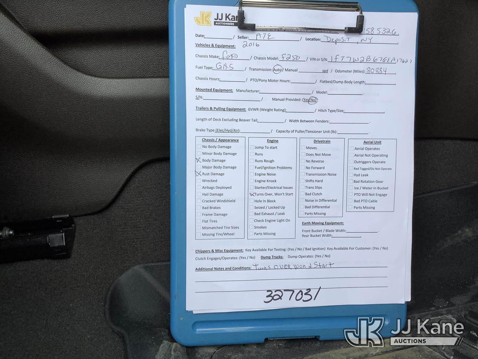 2016 Ford F250 4x4 Crew-Cab Pickup Truck, 8-cyl gas, Auto, A/C, with service cap, (80,884 miles) (Not Running, Turns Over Won’t Start, Condition Unknown, Check Engine Light On, Body/Rust Damage) (Seller States: This unit caught fire in engine area. It has an EVAP problem. Engine need hoses, new radiator, brakes, rotors, 4 wheel drive and new fuel tank. The passenger window with needs new track, will not open and close.) This is a Titled Item NOTE: This unit is being sold AS IS/WHERE IS via Timed Auction and is located in Deposit, NY. Inspection & preview days for this unit are by appointment only; please contact us at contact@jjkane.com or 84-Go-JJKane for more details. (Buyer is responsible for removal. Assistance by consignor or JJ Kane Auctions is not assured.)