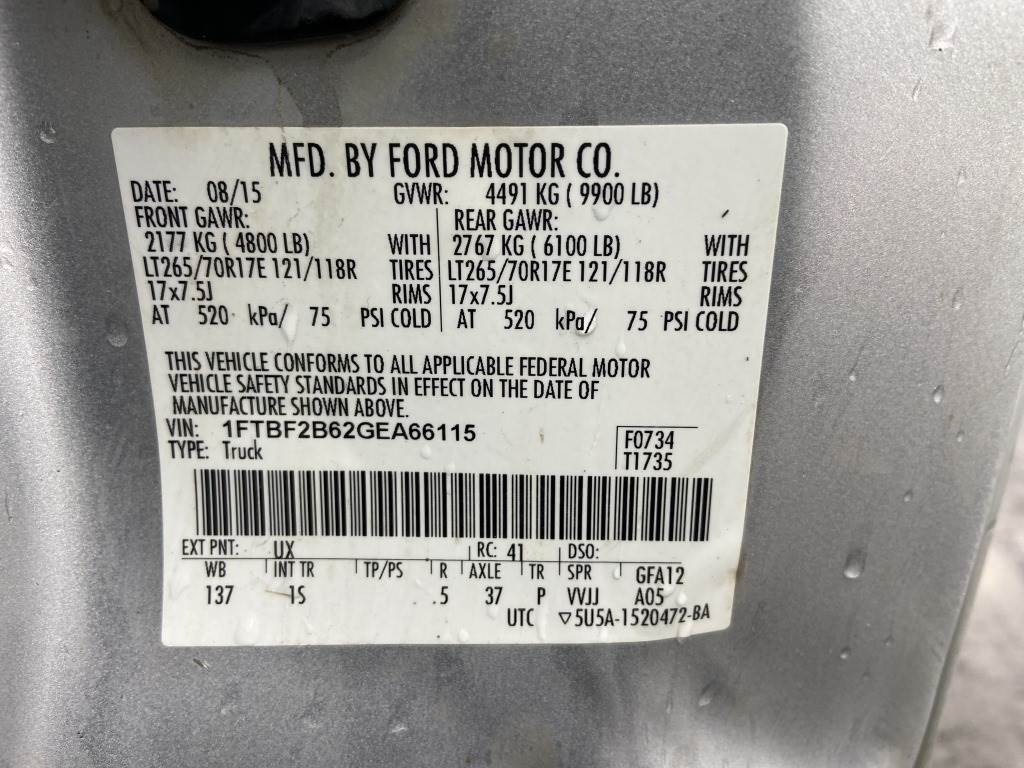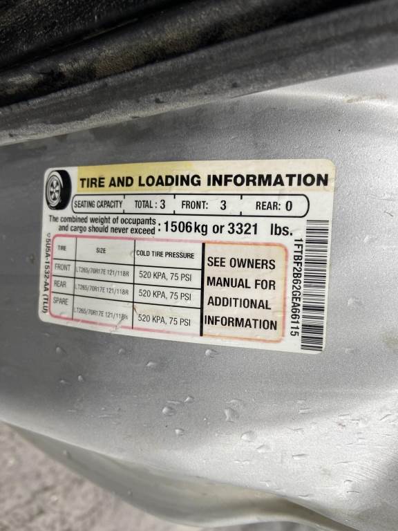 Location: Spokane WA ***End-User Consignment*** VIN: 1FTBF2B62GEA66115 Engine: 6.2L 8cyl Gas Transmission: Automatic *Body Damage* 8' Bed, running board, tow package, cruise control, A/C, A/M/F/M, CB radio, spring suspension, manual locking hubs, LT265/70/R17 tires, *** TITLE DELAY ***, Miles: 157,625