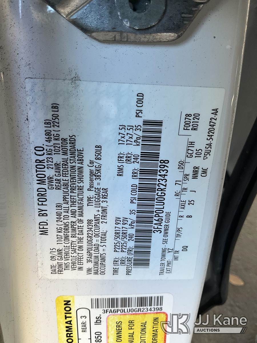 2016 Ford Fusion 4-Door Sedan, 4-cyl Hybrid CVT, A/C, (094,012 miles) (Runs & Moves) This is a Titled Item NOTE: This unit is being sold AS IS/WHERE IS via Timed Auction and is located in Jurupa Valley, CA. Inspection & preview days for this unit are the 2 business days prior to the first day of items closing for this auction, item is located at 4510 Muth Way Jurupa Valley, CA 92509 and hours of operations are 8a-4p. For pre-sale questions, please contact please contact Office Staff @ (310) 353-7140. Dealer License Number 45696. (Buyer is responsible for removal. Assistance by consignor or JJ Kane Auctions is not assured.)