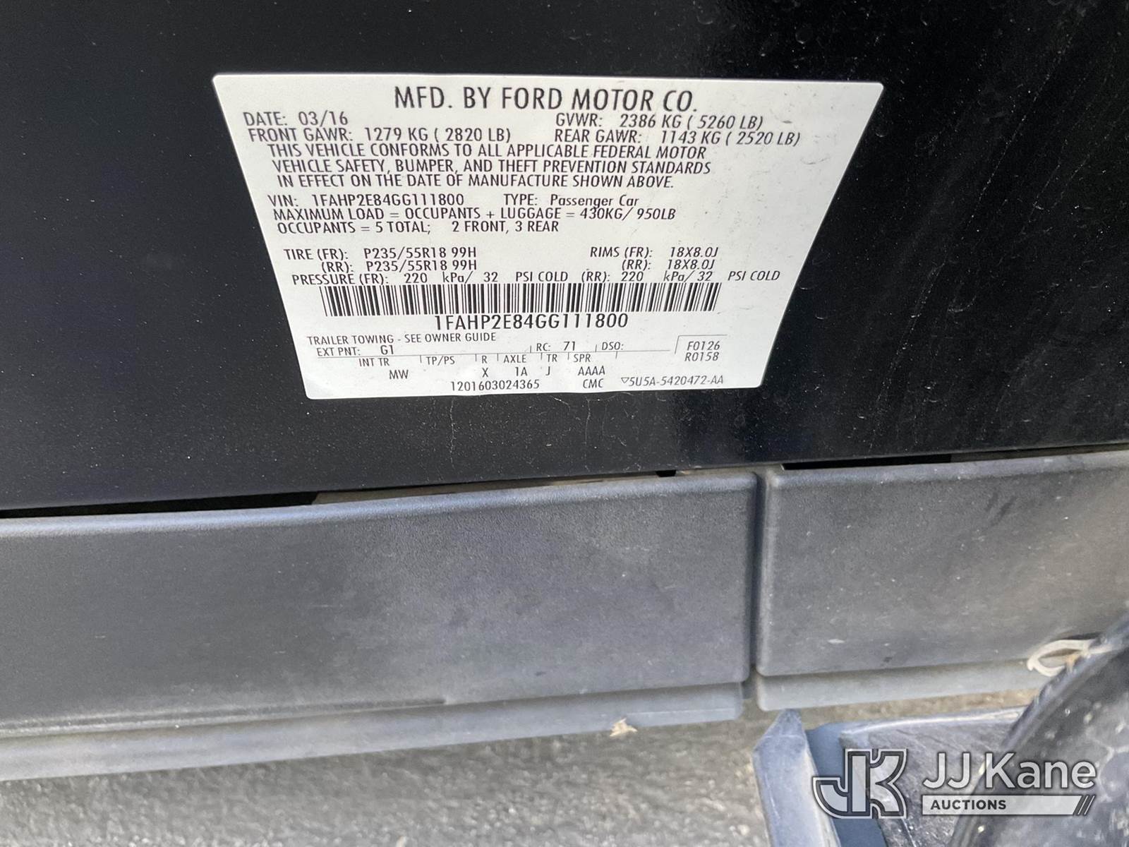 2016 Ford Taurus SEL FWD 4-Door Sedan, s/n 1FAHP2E84GG111800, 3.5L V6 DOHC 24V FWD, GAS, 6-Speed Automatic, A/C, (89,095 miles) (Runs & Moves, Open Recall, Remedy Not Yet Available, Vehicle is subject to an open NHTSA safety recall related to ON YOUR VEHICLE, THE REAR VIEW CAMERA COULD DISPLAY A BLANK OR DISTORTED IMAGE ON THE CENTER DISPLAY SCREEN WHEN THE VEHICLE IS IN REVERSE. YOU MAY ALSO RECEIVE A MESSAGE THAT THE REAR VIEW CAMERA IS UNAVAILABLE ON THE CENTER DISPLAY SCREEN., but a remedy for this recall does not appear to be available. Dealer is not authorized to perform the recall repair. Periodically contact the manufacturer or check the VIN on the NHTSA website at www.safercar.govivin to determine whether a remedy for the recall is available. As soon as a remedy is available, arrange to have the recall remedied with a dealer from that make of car to make such repair.) (Bidding Restricted to Licensed Vehicle Dealers Only), This is a Titled Item NOTE: This unit is being sold AS IS/WHERE IS via Timed Auction and is located in Jurupa Valley, CA. Inspection & preview days for this unit are the 2 business days prior to the first day of items closing for this auction, item is located at 4510 Muth Way Jurupa Valley, CA 92509 and hours of operations are 8a-4p. For pre-sale questions, please contact please contact Office Staff @ (310) 353-7140. Dealer License Number 45696. (Buyer is responsible for removal. Assistance by consignor or JJ Kane Auctions is not assured.)