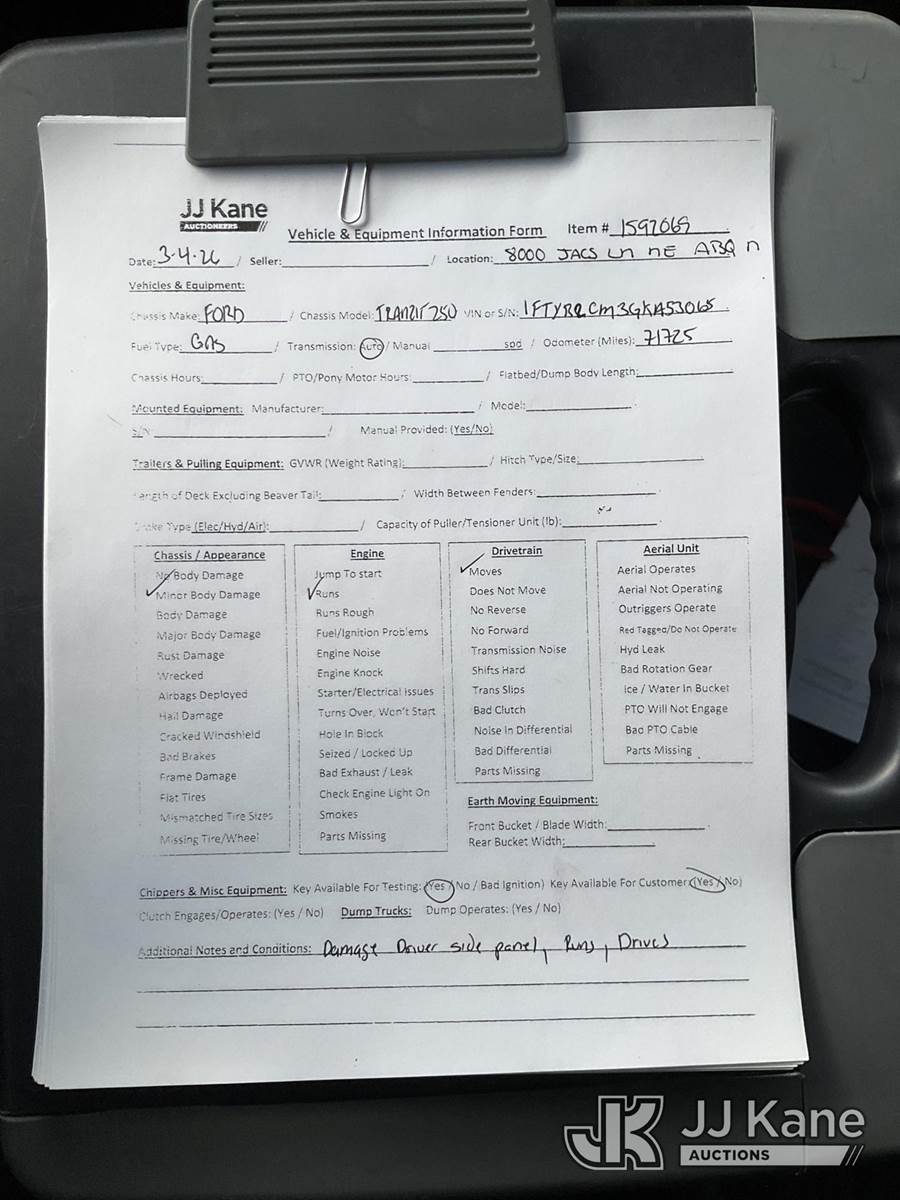2016 Ford Transit Cargo Van, 6-cyl gas, 6-Speed Automatic, A/C, (071,725 miles) (Runs & Moves) (Damage On Driver Side Panel) This is a Titled Item NOTE: This unit is being sold AS IS/WHERE IS via Timed Auction and is located in Albuquerque, NM. For more information & removal arrangements please contact Armando Beltran @ 505-991-0312. (Buyer is responsible for removal. Assistance by consignor or JJ Kane Auctions is not assured.)