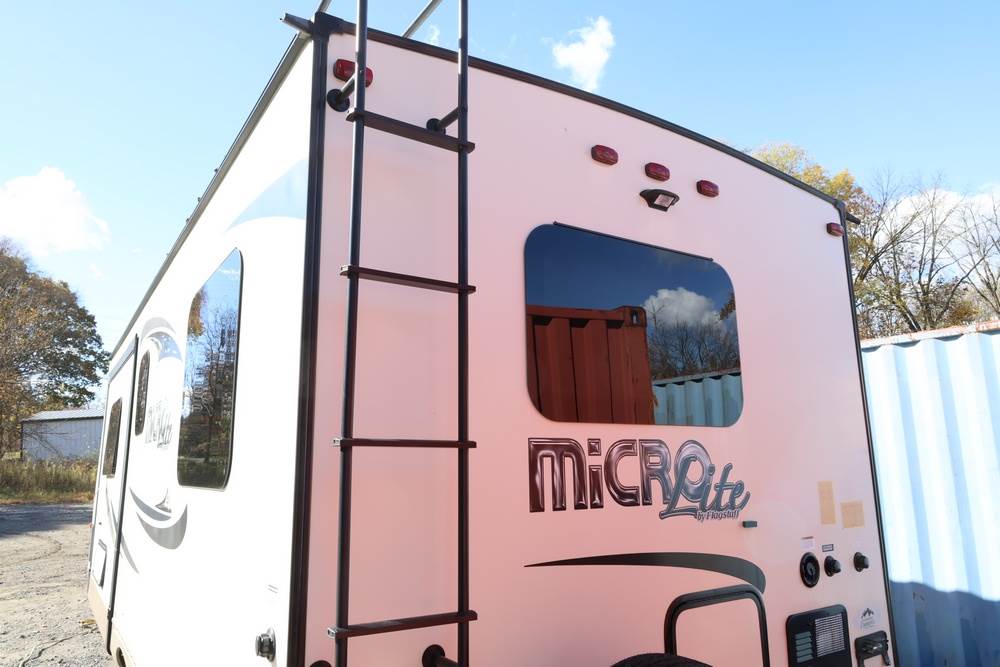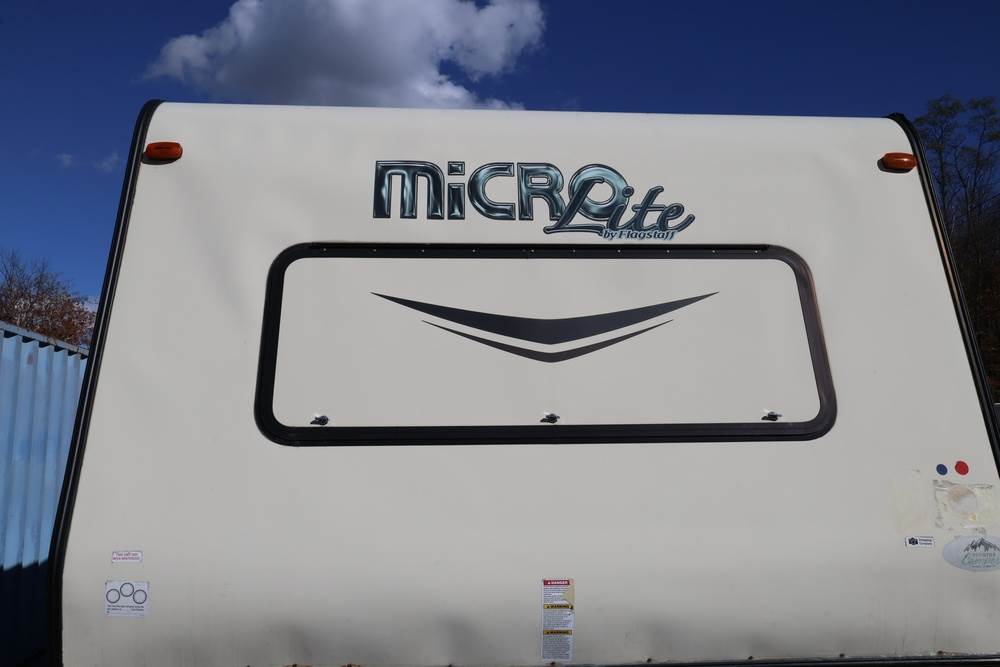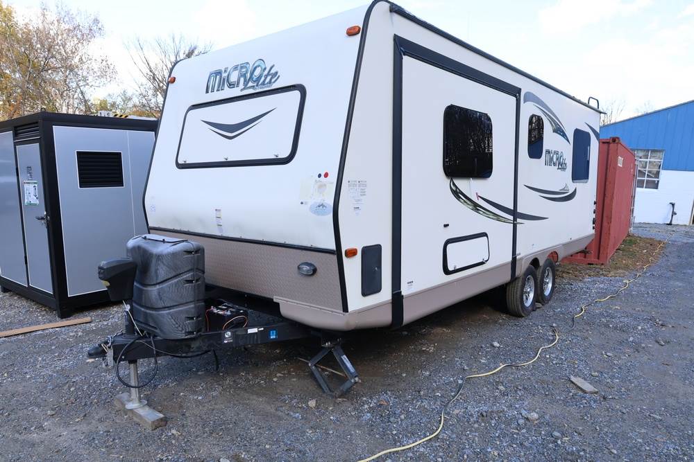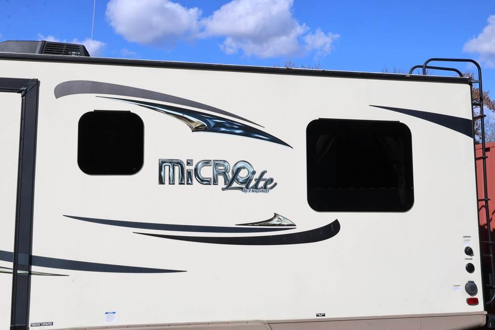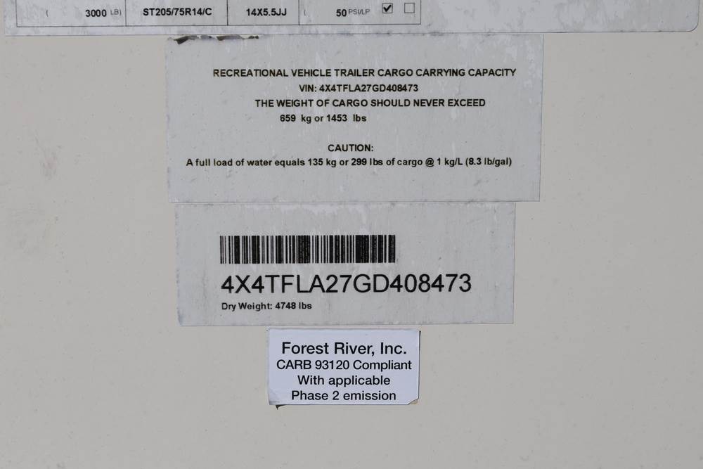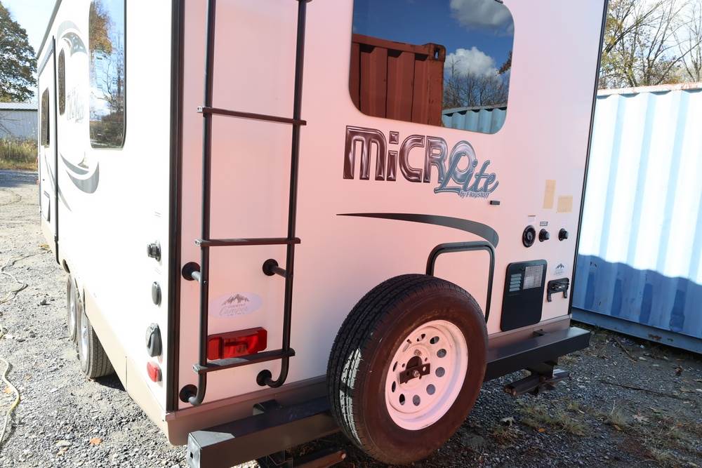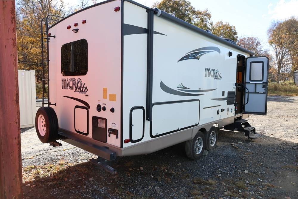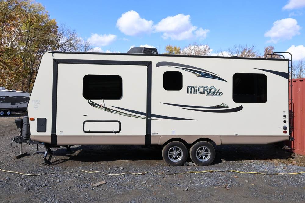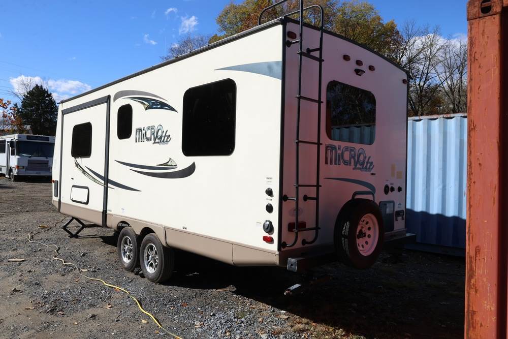 2016 Forest River Micro Lite travel trailer, model 25FKS, VIN: 4X4TFLA27GD408473. With a dry weight of 4,748 lbs and a cargo carrying capacity of 1,453 lbs. It has a gross vehicle weight rating (GVWR) of 6,260 lbs, and rides on ST205/75R14C tires with a specified cold tire pressure of 50 PSI. The trailer includes dual axles rated at 3,000 lbs each, a front kitchen layout, and features a Domestic refrigerator, propane/electric water heater, and a combination stove and oven. It is equipped with an electric tongue jack, rooftop air conditioning, slide-out section, power awning, and ladder access at the rear. Unknown electrical issue, power slide does not function, needs to be manually opened (tool not included). NO KEY for the door. Title available Title will transfer via dealer paperwork in Highland NY.