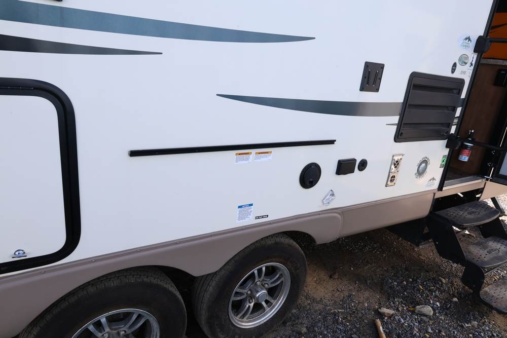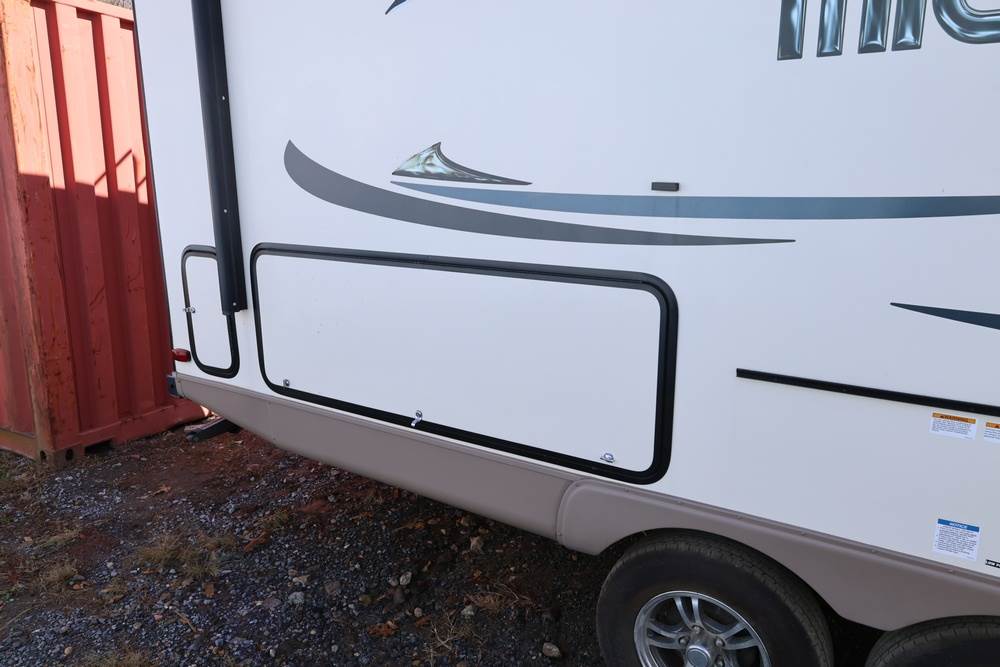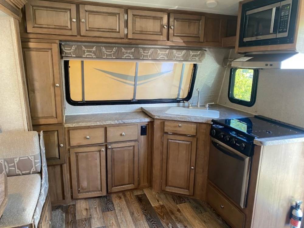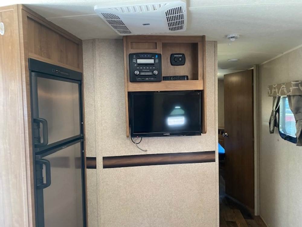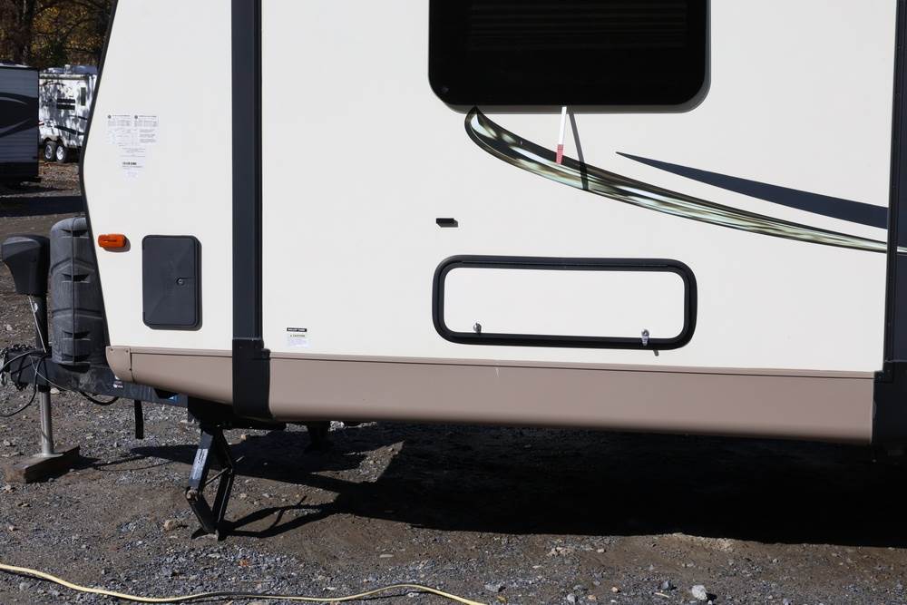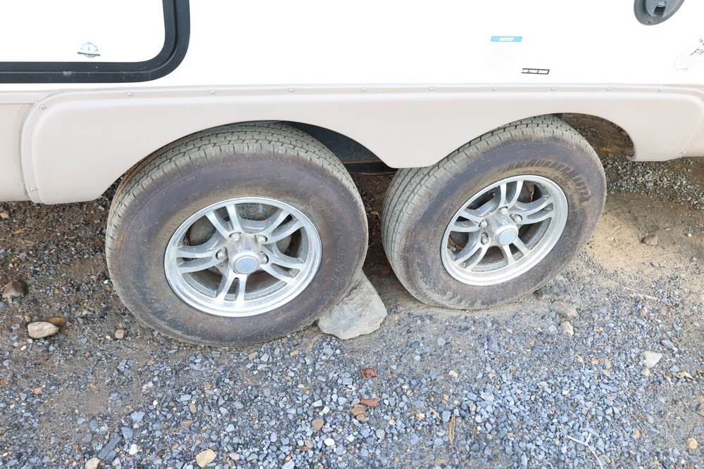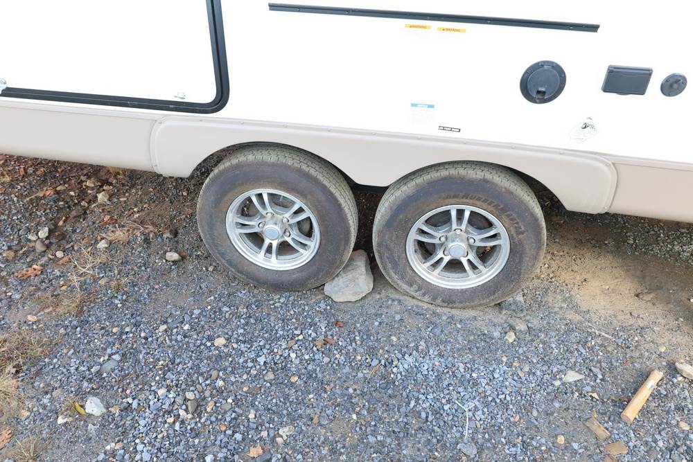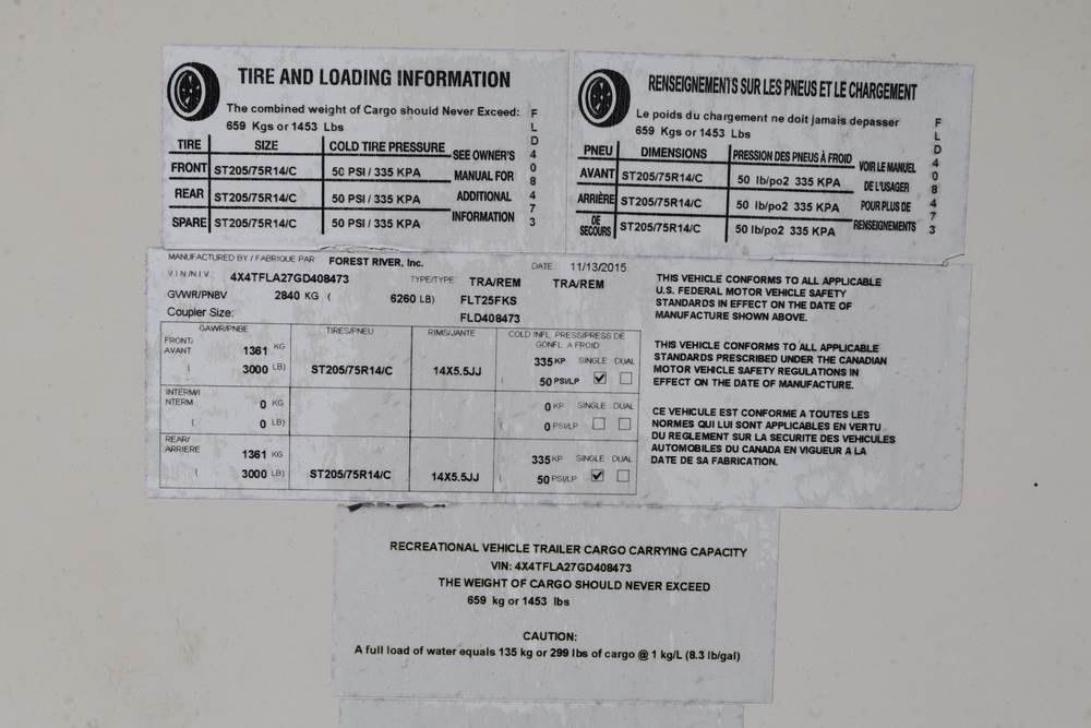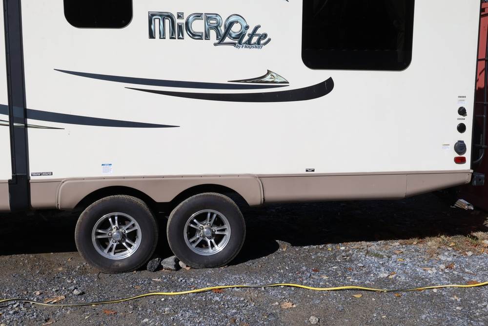 2016 Forest River Micro Lite travel trailer, model 25FKS, VIN: 4X4TFLA27GD408473. With a dry weight of 4,748 lbs and a cargo carrying capacity of 1,453 lbs. It has a gross vehicle weight rating (GVWR) of 6,260 lbs, and rides on ST205/75R14C tires with a specified cold tire pressure of 50 PSI. The trailer includes dual axles rated at 3,000 lbs each, a front kitchen layout, and features a Domestic refrigerator, propane/electric water heater, and a combination stove and oven. It is equipped with an electric tongue jack, rooftop air conditioning, slide-out section, power awning, and ladder access at the rear. Unknown electrical issue, power slide does not function, needs to be manually opened (tool not included). NO KEY for the door. Title available Title will transfer via dealer paperwork in Highland NY.