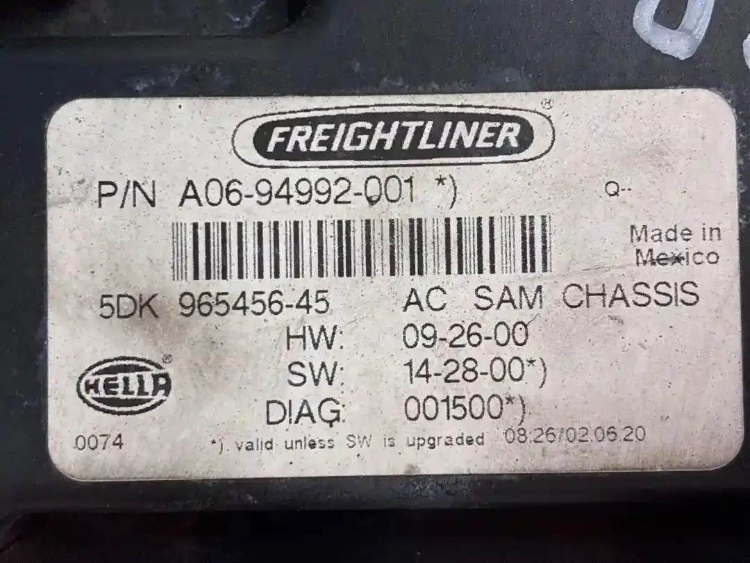 (Used) 2016 Freightliner Cascadia 125, CHASSIS CONTROL MODULE- VEHICLE ECM- Part Number: A0694992001, 5DK 965456-45, AC SAM CHASSIS, HW: 09-26-00, SW: 14-28-00, DIAG: 001500, 0074, X51 Plug with 6 Pins, X52 Plug with 9 Pins, X53 Plug with 9 Pins, X54 Plug with 2 Pins, X55 Plug with 4 Pins, X57 Plug with 15 pins, X58 Plug with 21 Pins, X59 Plug with 21 Pins, For more information about this item, give us a call. We ship Worldwide! (CRG HEAVY TRUCK PARTS) 929 W PULASKI HWY, ELKTON, MD 21921