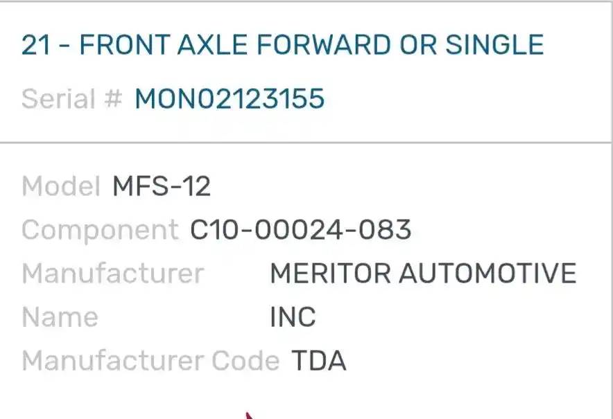 (Used) 2016 Freightliner Cascadia 125, FRONT SPINDLE/KNUCKLE- Part Number: C10-00024-083, Serial Number: MON02123155, Side: Driver Left Side, Make: Meritor, Model: MFS12143A, Capacity: 12,000 Lbs, Hub Bolts: 10, Brake Type: Drum, For more information about this item, give us a call. We ship Worldwide! (CRG HEAVY TRUCK PARTS) 929 W PULASKI HWY ELKTON, MD 21921, Capacity: 12,000 Lbs, Serial#: MON02123155, Hub Bolts: 10, Brake Type: Drum