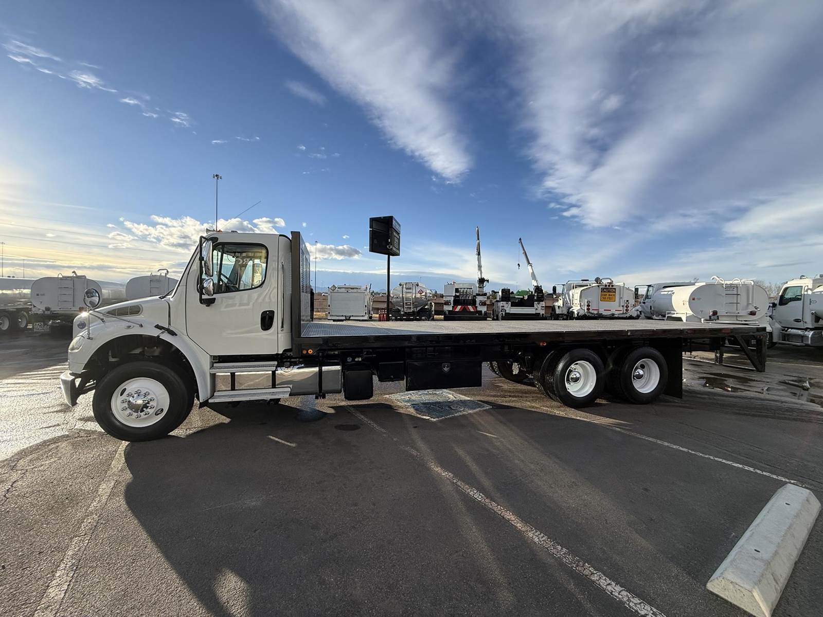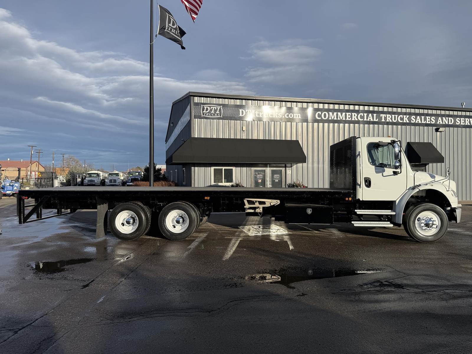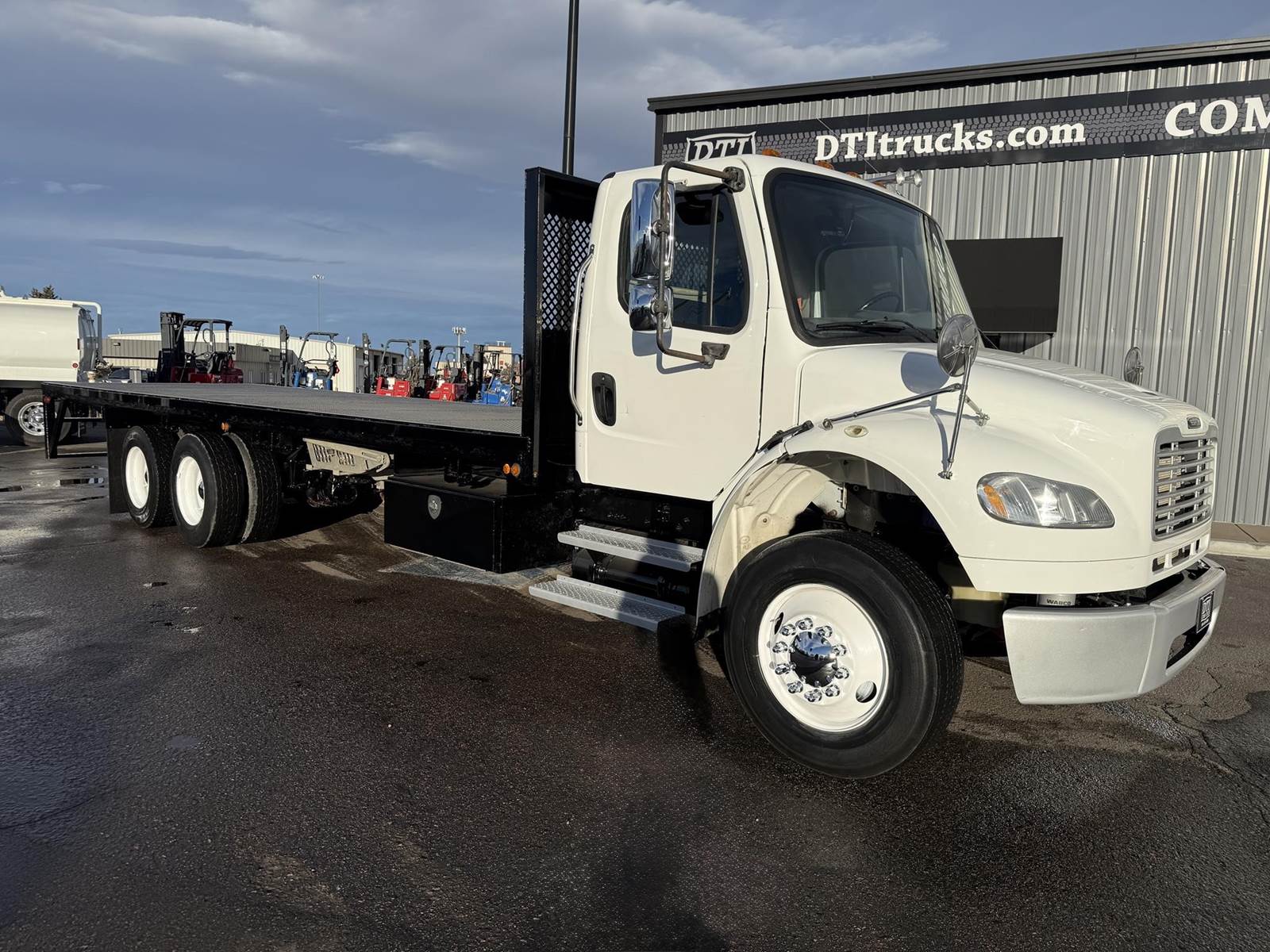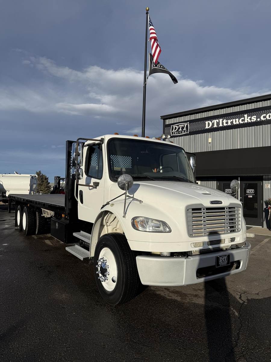 2016 Freightliner M2-106 Tandem Axle 28’ Flatbed Truck, 8.9L Cummins ISL Diesel Engine, 300 HP, Exhaust Brake, Allison 3000 HS 6 Speed Automatic Transmission, ONLY 122,698 ECM Verified Miles & 3,507 ECM Verified Engine Hours, 53.3K GVWR (13.3K Steer Axle, 40K Combined Drive Axles), DOUBLE FRAME, 4.78 Axle Ratio, FULL LOCKERS, 270” Wheel Base, 204” CTA, Spring Suspension, 275/80R22.5 Steer Tires, 295/75R22.5 Drive Tires All Mounted On Steel Wheels, 80 Gallon Aluminum Diesel Fuel Tank, Block Heater, CARB Compliant, Air Brakes, Air Conditioning, Tilt & Telescoping Steering Wheel, Cruise Control, Bluetooth Radio, Back Up Camera, Power Windows & Locks, Power & Heated Mirrors, Air Ride Cab, Air Ride Driver Seat, Bench Passenger Seat, 28’ Steel Deck Flatbed, 102” Wide To Rub Rails, (2) 4’ Tool Boxes, (12) Sliding Strap Winches. This Freightliner Tandem Axle 28’ Flatbed Is Available At DTI Trucks In Denver, CO. Stock #18058D. Call Or Text Brent For More Information (303) > 598 > 1923