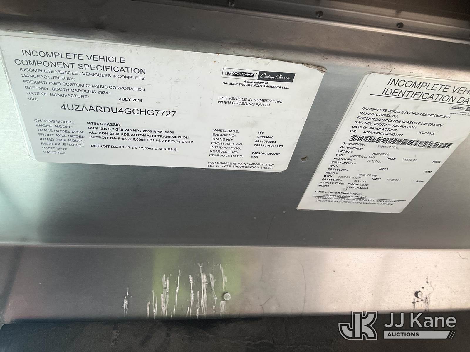 2016 Freightliner MT55 Hybrid Step Van, 6.7L Diesel/Electric, Auto, A/C, with Allison Odyne Hybrid System , (68,460 miles) (Runs & Moves) This is a Titled Item NOTE: This unit is being sold AS IS/WHERE IS via Timed Auction and is located in Rome, NY. Inspection & preview days for this unit are the 2 business days prior to the first day of items closing for this auction, item is located at 5835 Success Dr Rome, NY 13440 and hours of operations are 8a-4p. For pre-sale questions, please contact Ryan Jackson @ (315) 749-3790 or Ryan.Jackson@jjkane.com. Sales Tax Collected Based on Residency (Buyer is responsible for removal. Assistance by consignor or JJ Kane Auctions is not assured.)