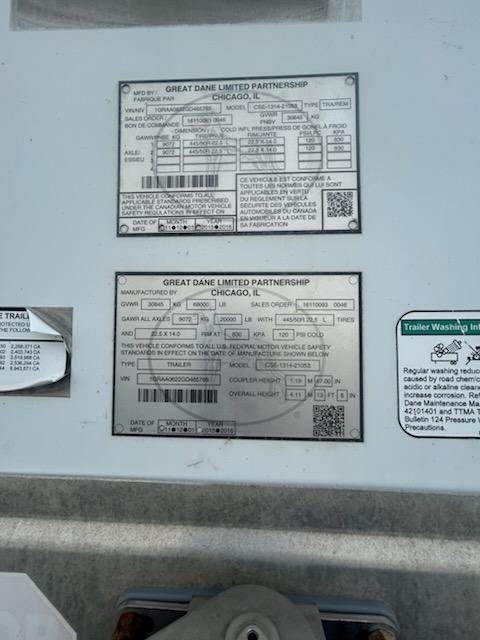 2016 Great Dane 53' Dry Van - READY TO GO TO WORK. DRY. Air Suspension, Good Brakes, Good Tires, 53' X 102" *** 1982 International Cab Over also AVAILABLE FOR SALE!!! CALL FOR MORE INFO!!