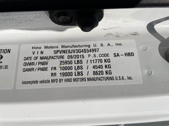 2016 Hino 268 26' x 102" x 103" Single-Axle Dry Van Delivery Truck, Hino J08E-VC 7.7L @ 220 H.P., Exhaust Brake, Allison 5-Speed Automatic O/D Transmission, 5.57 Ratio, Spring-Suspension, 270" W.B., 25,950# G.V.W.R., NON-CDL, Hydraulic Brakes, 10K Front-Axle, 19K Rear-Axle, Steel Wheels, 11R-22.5 Tires, Morgan F.R.P. Body, Waltco 2.5K Steel Tuk-A-Way Lift-Gate, Roll-Up Rear Door, Aluminum Roof, Wood Slat-Lined, (2) Rows of E-Trac, Wood Floor, 24" Steel Threshold, 10" Wood Scuffliner, Horizontal Exhaust, D.P.F. Equipped, DEF Required, Aluminum Fuel Tank, P/S, A/C, C/C, Tilt-Telescoping Steering Column, Dual Power Windows, Dual 4-Way Power Mirrors, Mirror Heat, Fleet Maintained, Commercial Financing Available O.A.C., 156,234 Miles!