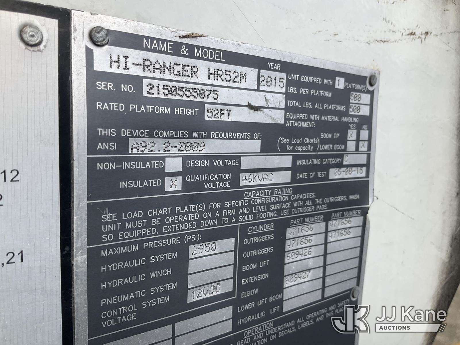 HiRanger HR52-M, 57 ft, Material Handling Bucket Truck s/n 2150555075, with single-man bucket & 4 hyd outriggers, rear mounted on 2016 Freightliner M2 Medium Duty Utility Truck, Cummins 6.7L Auto, 4X2, diesel, A/C, (88,484 miles) (Runs, Moves & Upper Operates) (Reads 8,712 hours) This is a Titled Item NOTE: This unit is being sold AS IS/WHERE IS via Timed Auction and is located in Shrewsbury, MA. Inspection & preview days for this unit are the 2 business days prior to the first day of items closing for this auction, item is located at 11 Fortune Blvd Shrewsbury, MA 01545 and hours of operations are 8a-4p. For pre-sale questions, please contact Rob Gifford @ (508) 864-4126. (Manuals provided in cab) (Buyer is responsible for removal. Assistance by consignor or JJ Kane Auctioneers is not assured.)