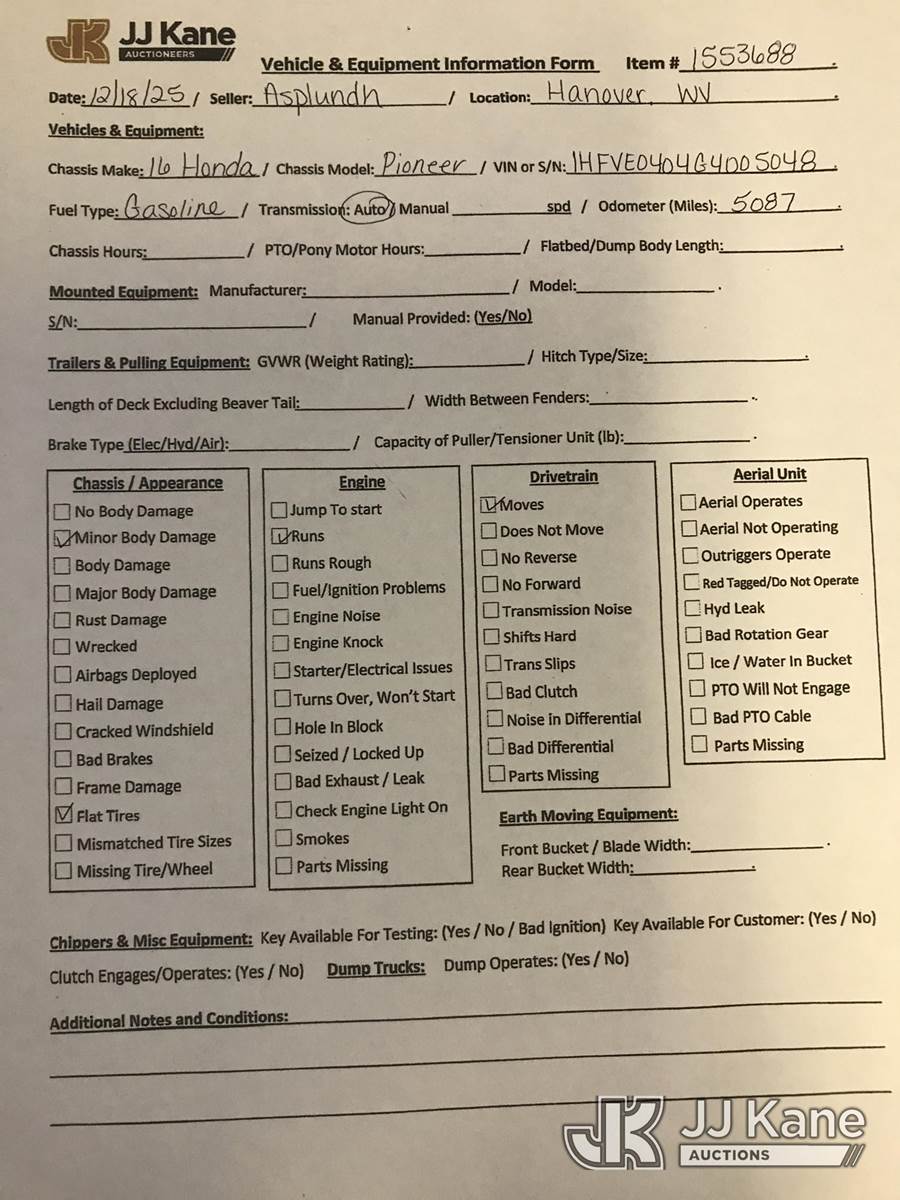 2016 Honda Pioneer 1000-5 All-Terrain Vehicle, Auto, gas, with front winch, (5,087 miles) (Runs & Moves) (Flat Tire, Body Damage) (Per Seller: Front Differential Is Bad) This is a Titled Item NOTE: This unit is being sold AS IS/WHERE IS via Timed Auction and is located in Hanover, WV. Inspection & preview days for this unit are by appointment only; please contact us at contact@jjkane.com or 84-Go-JJKane for more details. (Buyer is responsible for removal. Assistance by consignor or JJ Kane Auctions is not assured.)