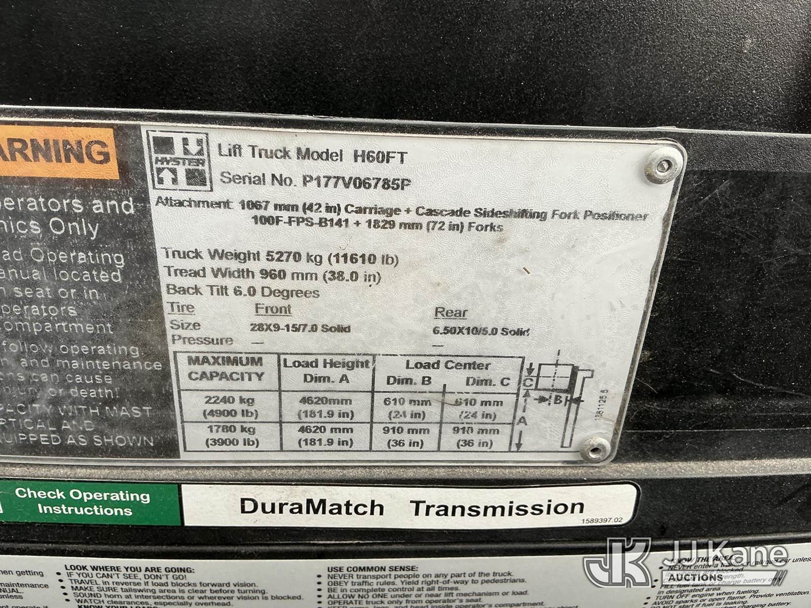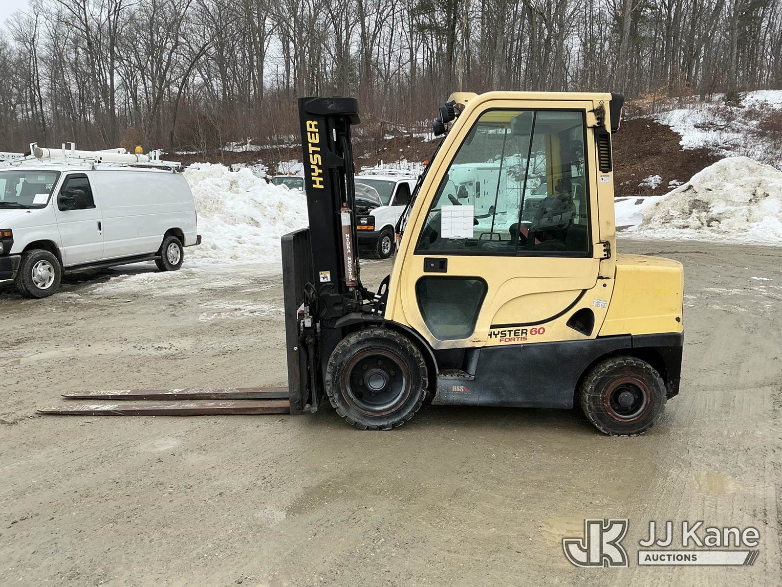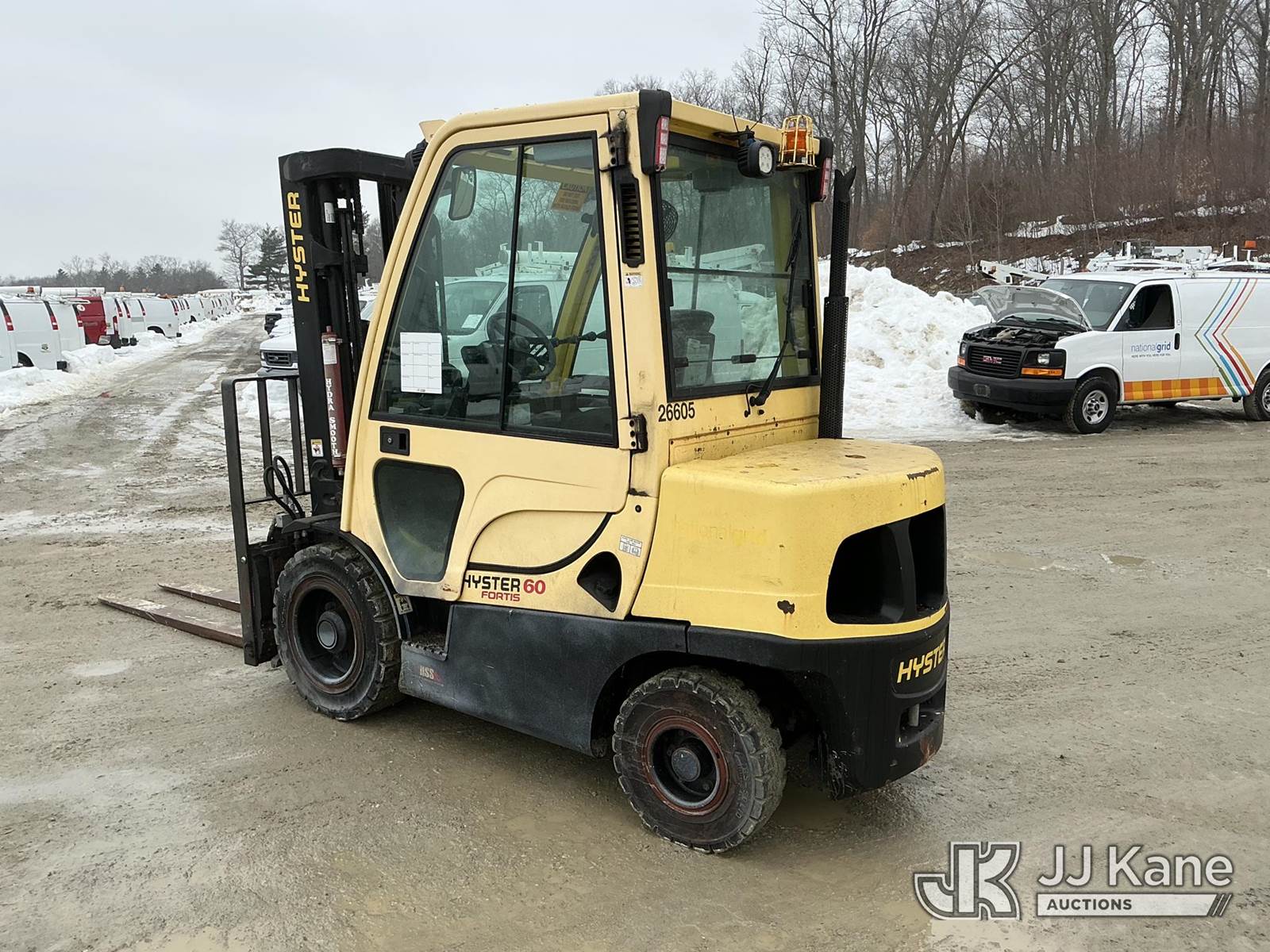 2016 Hyster H60FT Rubber Tired Forklift, s/n P177V06785P, Kubota diesel, Shuttle, with 4,900 LB capacity, 181.9 in. max lift height, 6 ft. forks & EROPS, (Runs, Moves & Operates) (Reads 708 hours) NOTE: This unit is being sold AS IS/WHERE IS via Timed Auction and is located in Shrewsbury, MA. Inspection & preview days for this unit are the 2 business days prior to the first day of items closing for this auction, item is located at 11 Fortune Blvd Shrewsbury, MA 01545 and hours of operations are 8a-4p. For pre-sale questions, please contact Rob Gifford @ (508) 864-4126. (Buyer is responsible for removal. Assistance by consignor or JJ Kane Auctions is not assured.)