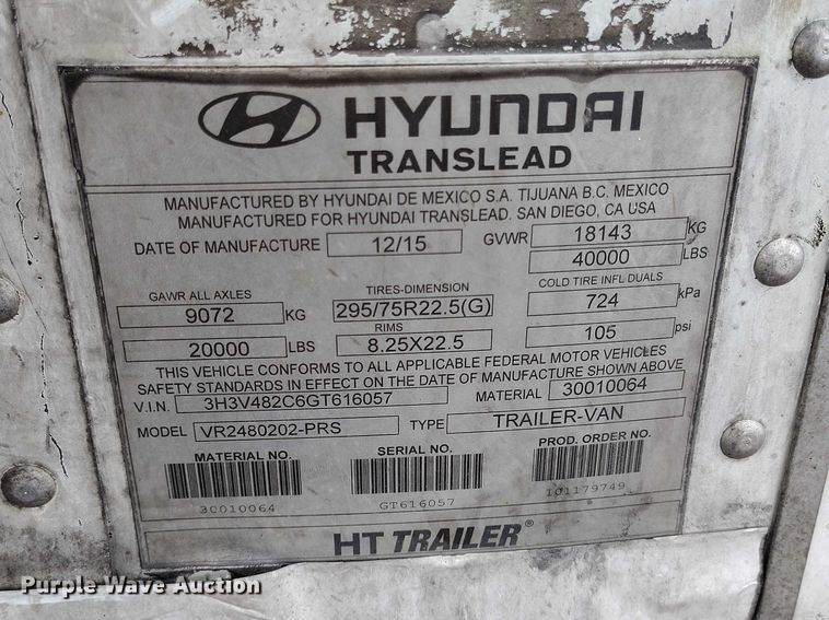 2016 Hyundai Translead VR2480202-PRS refrigerated van trailer, VIN: 3H3V482C8GT616061, Unit #: C57060, Dimensions, Overall, Length: 48',...