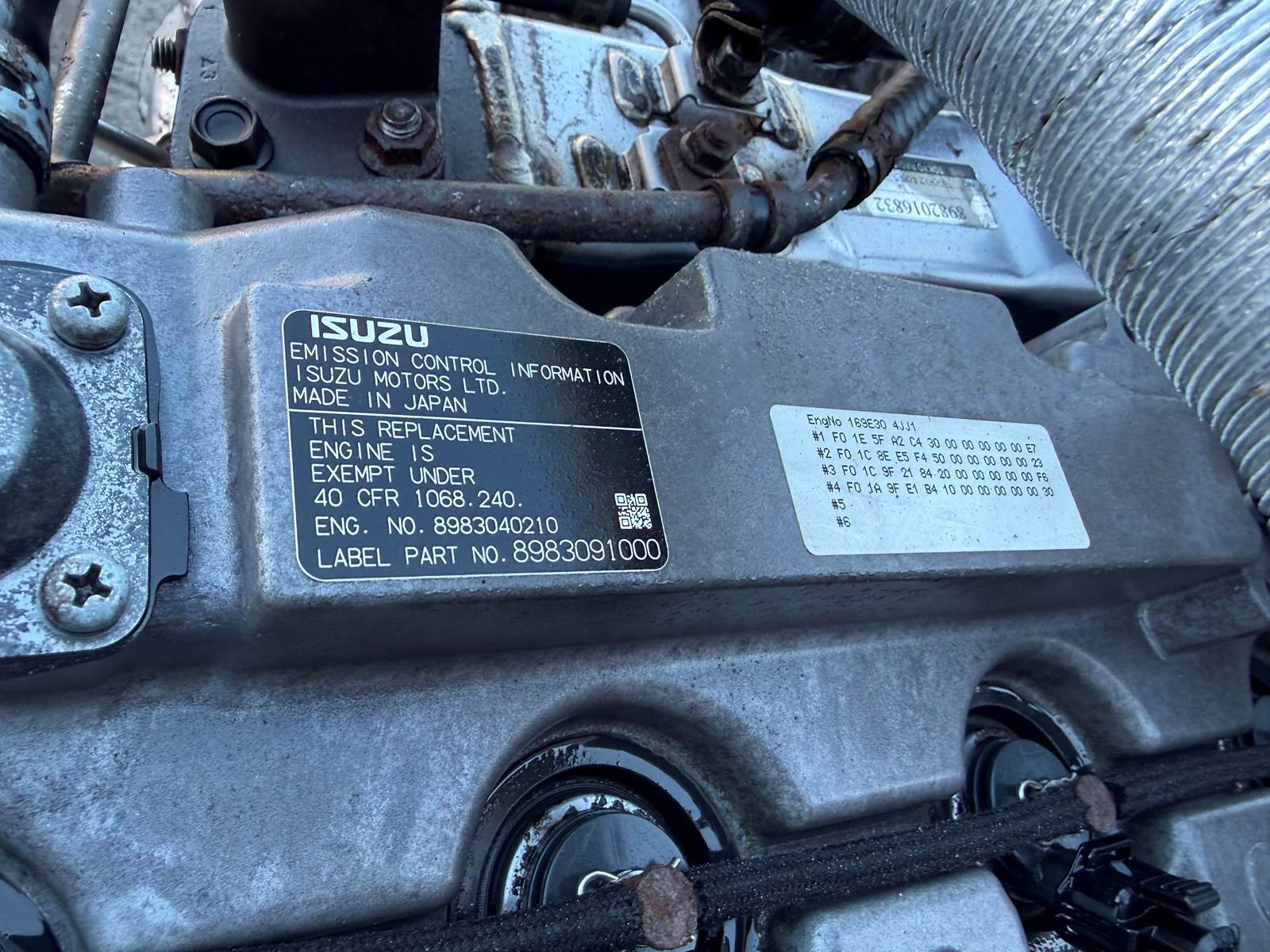 (GOOD USED/ RUN TEST/ FULLY INSPECTED) 2016 Isuzu 4JJ1 TC 3.0 Diesel Engine (EPA13), Part # 8983040210, Label Part # 8983091000, Serial # 4JJ1-169E30, 3.0L, 51,054 Miles, Out Of 2017 Isuzu NPR ECOMAX 3.0L, TEST RUN PERFECT!, FULLY INSPECTED!!! 175HP @ 2700RPM. visit JJREBUILDERS for more information on this engine or any other diesel engine you may be looking for call REF INV # 006748