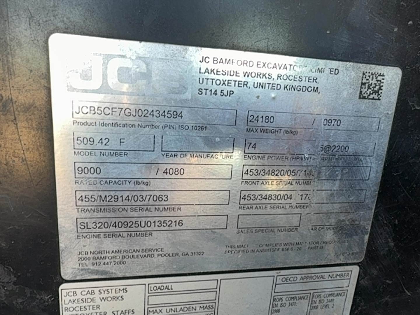 Brand/model: JCB 509-42, Year: 2016, Hours: 5,225, Reach: 42', Cab: Enclosed, Capacity: 9,000 lbs, Tires: Solid, Drive type: 4WD,...