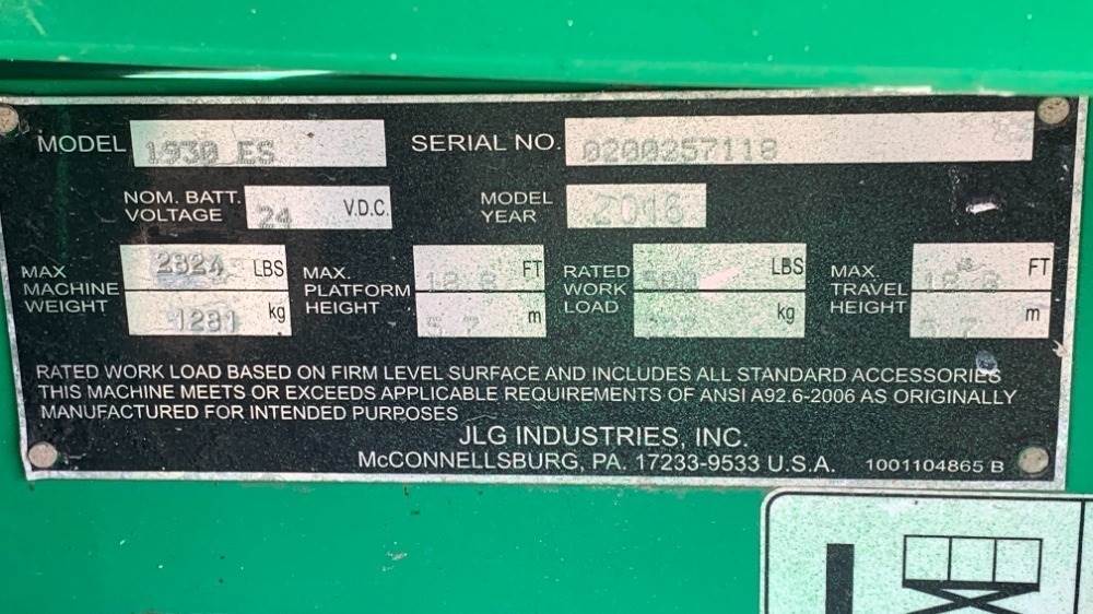 2016 JLG 1930ES SCISSORLIFT, electric, 19' lift, extendable platform, 317 hours indicated. s/n:0200257118