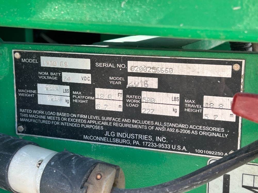 2016 JLG 1930ES SCISSORLIFT, electric, 19' lift, extendable platform, 365 hours indicated. s/n:0200256660