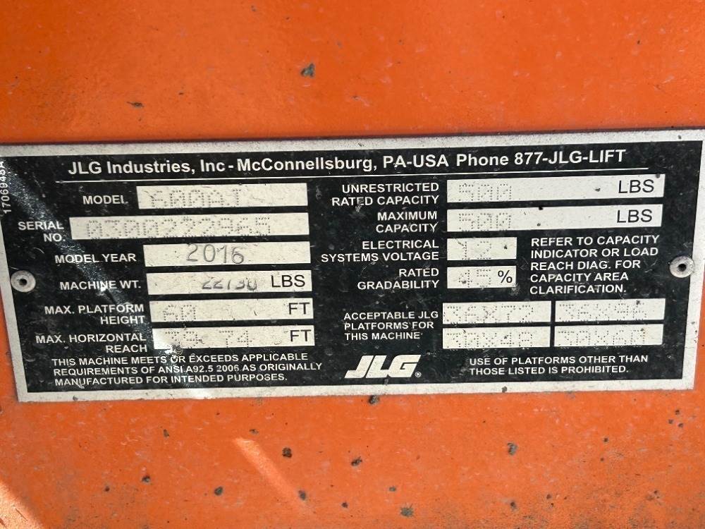 2016 JLG 600AJ BOOMLIFT, Duetz diesel, 2-stage, 60' articulated boom, 6' jib, 4x4, foam filled tires, 2,181 hours indicated. s/n:0300222965