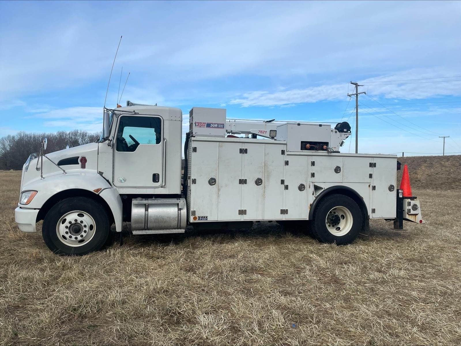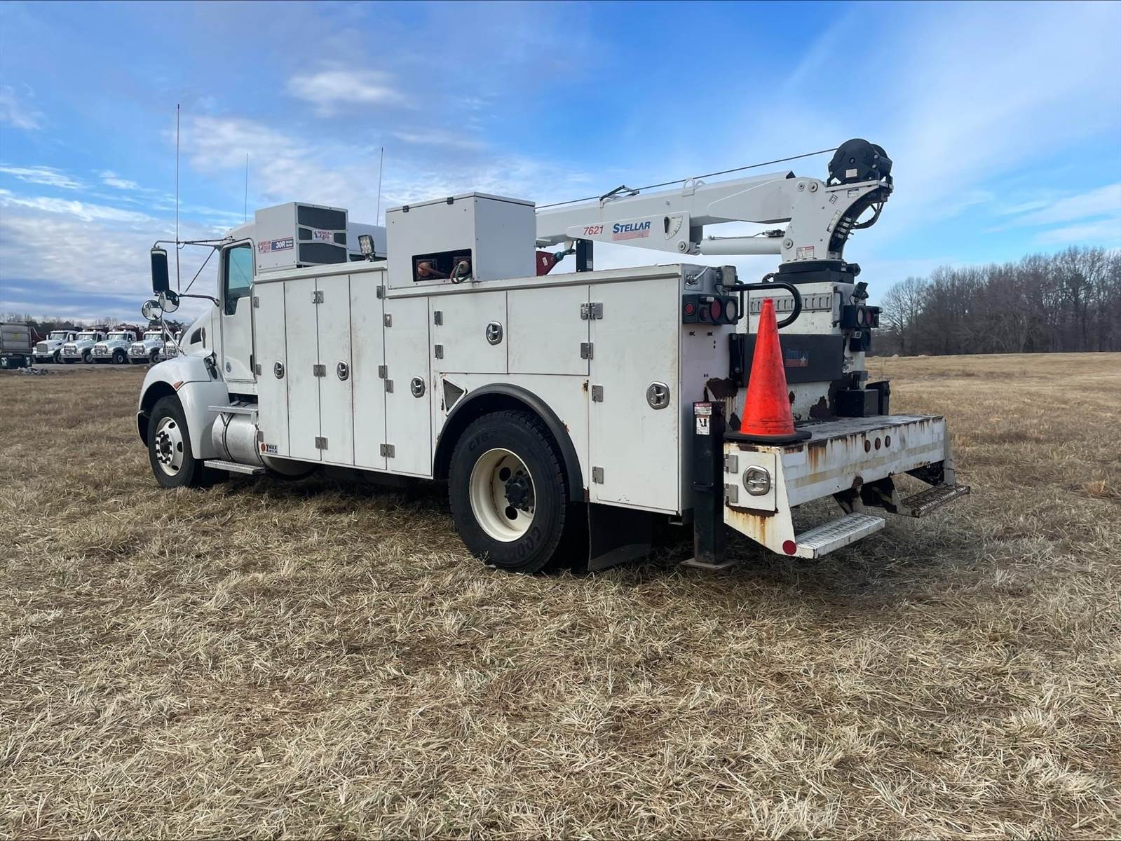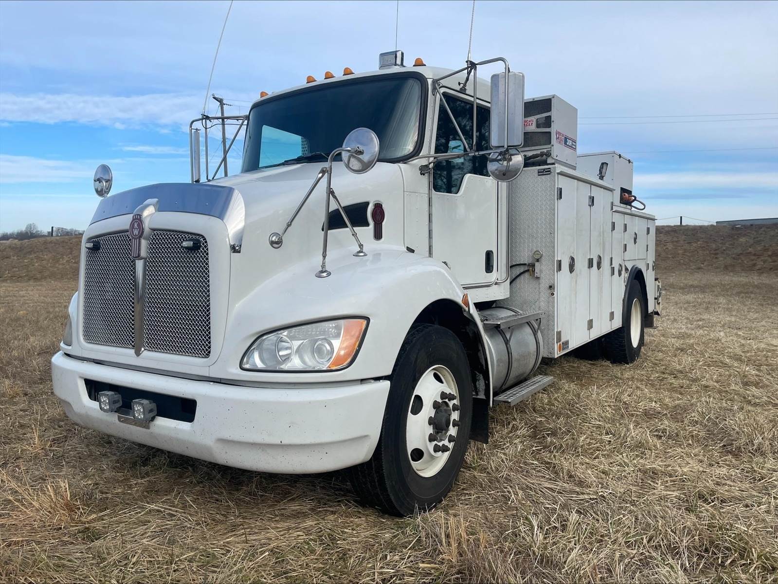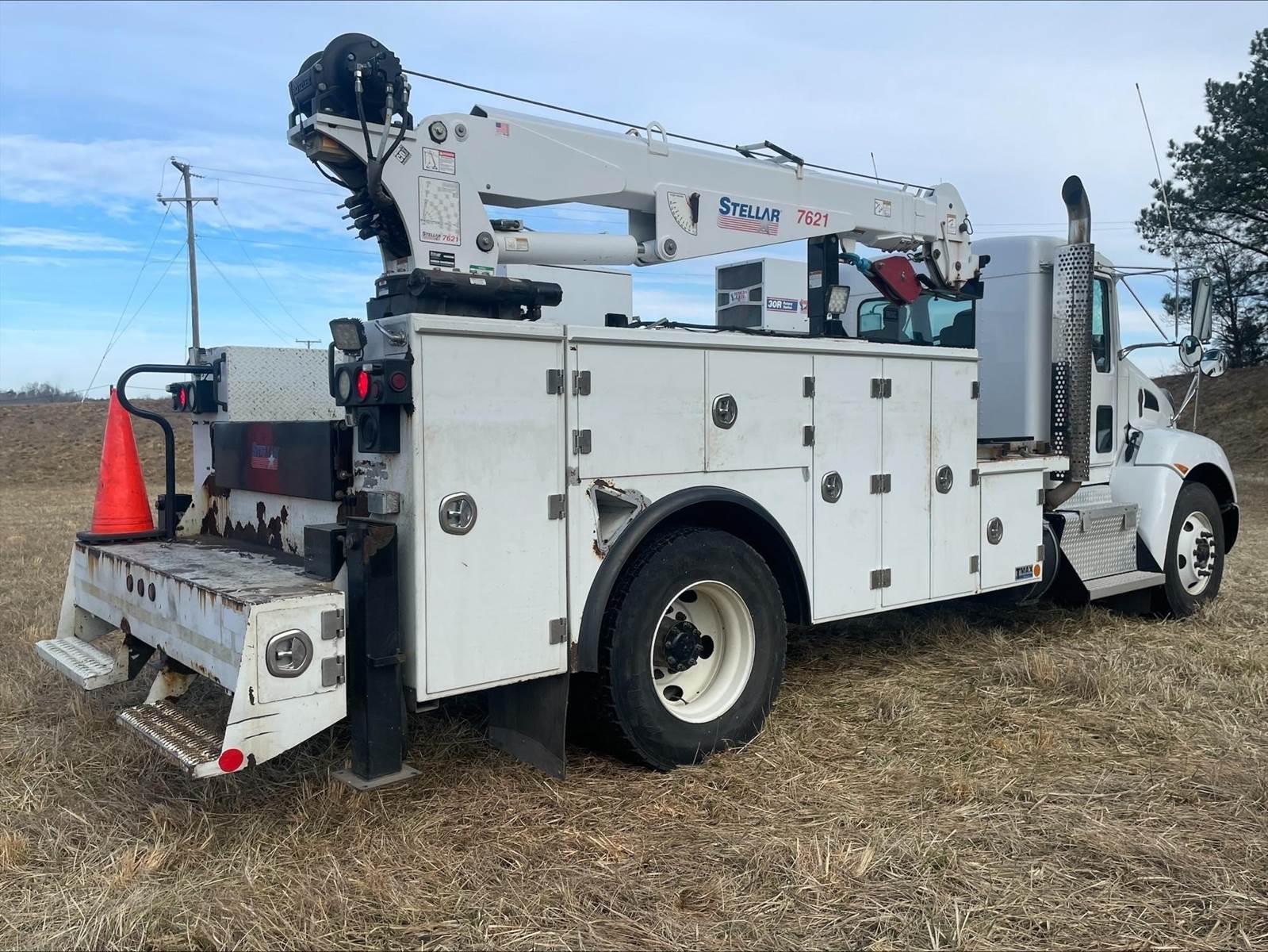 Single Axle, 14' Service Body, Stellar 7621 Crane (7,500 Capacity), Hydraulic Outriggers, American Eagle 30R Compressor, Power Inverter, (7) 28" Drawers, (7) 16" Drawers, (7) 14" Drawers, Air Reel, Acetylene/Oxygen Reels, PX9 Paccar 300 HP, Allison Automatic 6 Speed, 5.57 Ratio, Engine Brake, Spring Suspension, 192" WB, 12K FA, 21K RA, 33K GVWR, P/S, A/C, AM/FM CD Bluetooth, Heated Mirrors, Cruise, Wheel Lock, Tilt/Tele Wheel, Power Windows and Locks, 75 Gallon Aluminum Fuel Tank, 11R22.5 Tires on Steel Wheels