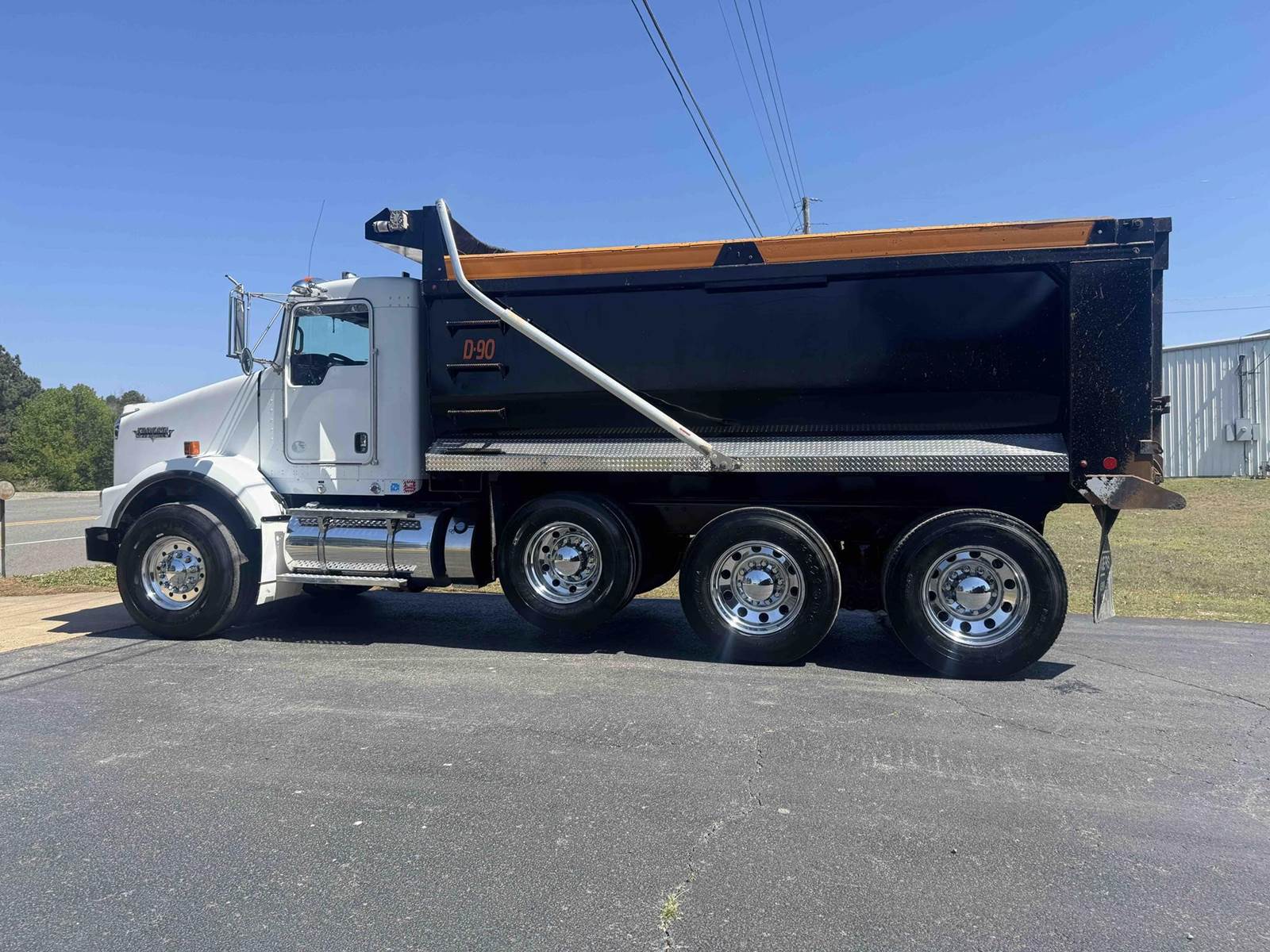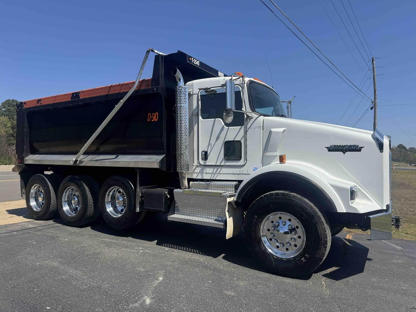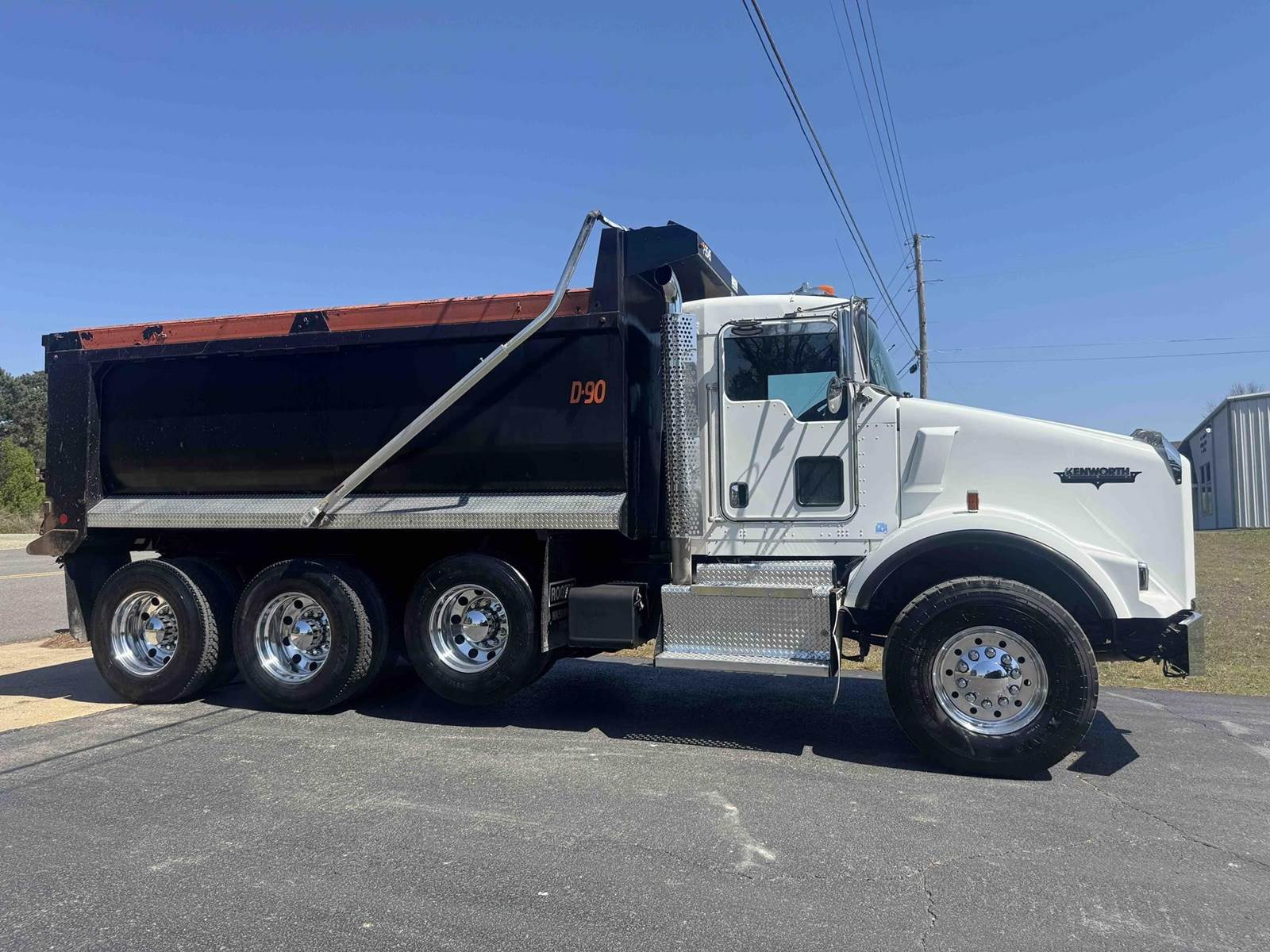 2016 KENWORTH T800 TRI-AXLE FACTORY DUMP TRUCK, 382,496 VERIFIED MILES, CUMMINS ISX-15 450, DELETED AND TUNED TO 500HP, EATON 8LL TRANSMISSION, ENGINE BRAKE, 20,000 LB FRONT AXLE, 22,500 LB PUSHER AXLE, 46,000 LB REAR AXLES, CHALMERS SUSPENSION, FULL LOCKING REARS, DOUBLE FRAME, DUAL POWER STEERING BOXES, ROGERS 16 FOOT MILLENNIUM AR450 STEEL BODY, 24.5 DRIVE TIRES WITH 425/65/R22.5 STEER TIRES, WITH ALL ALUMINUM WHEELS.