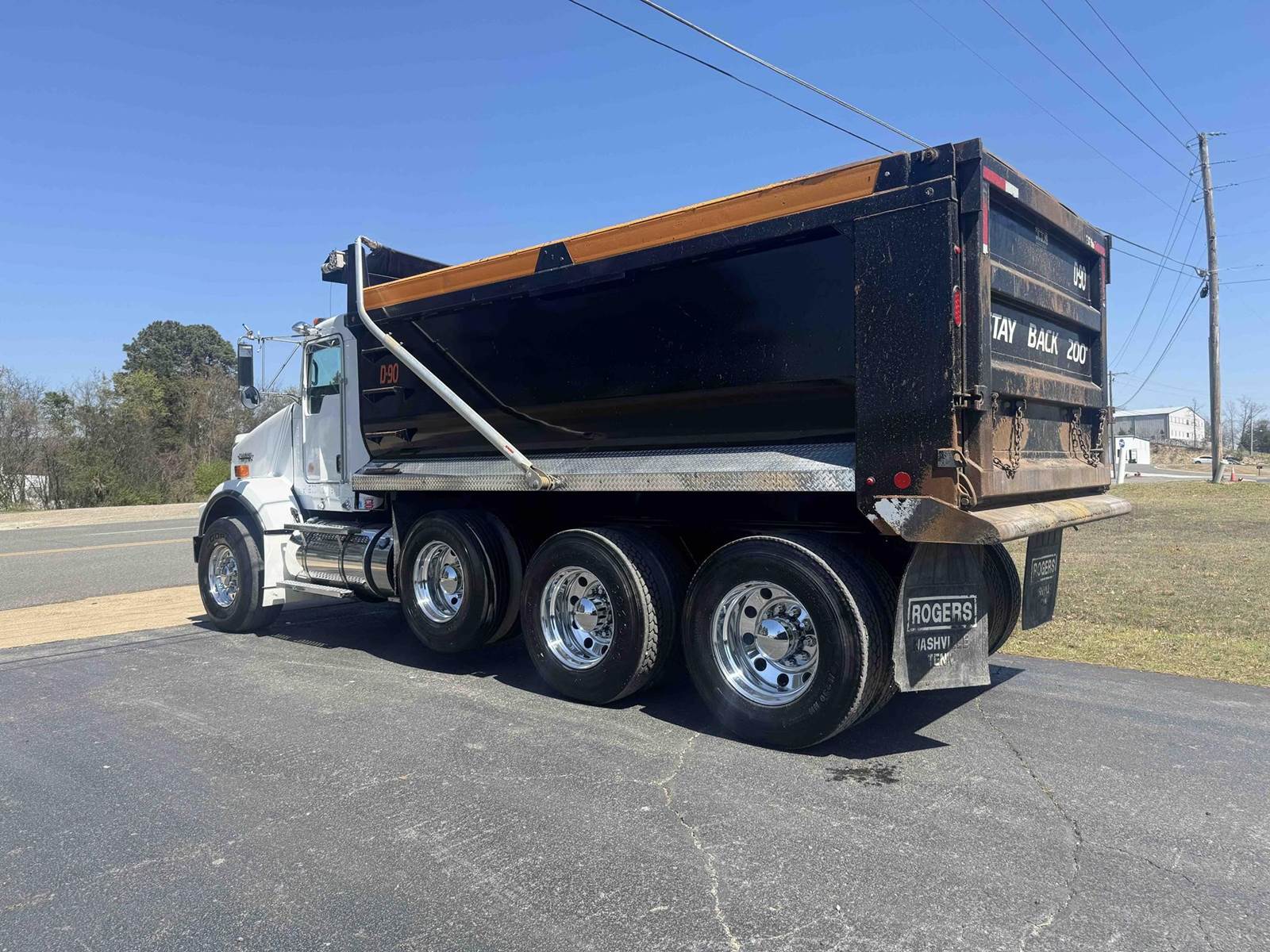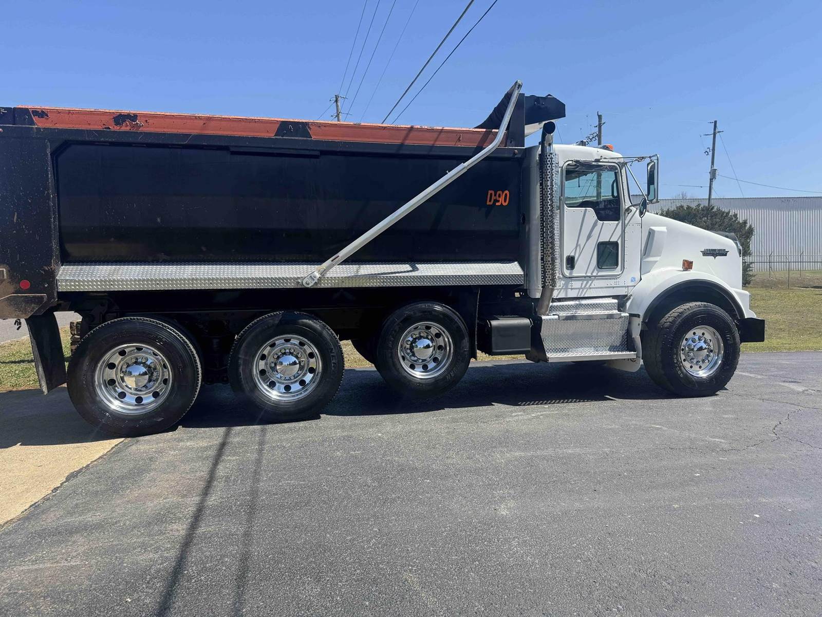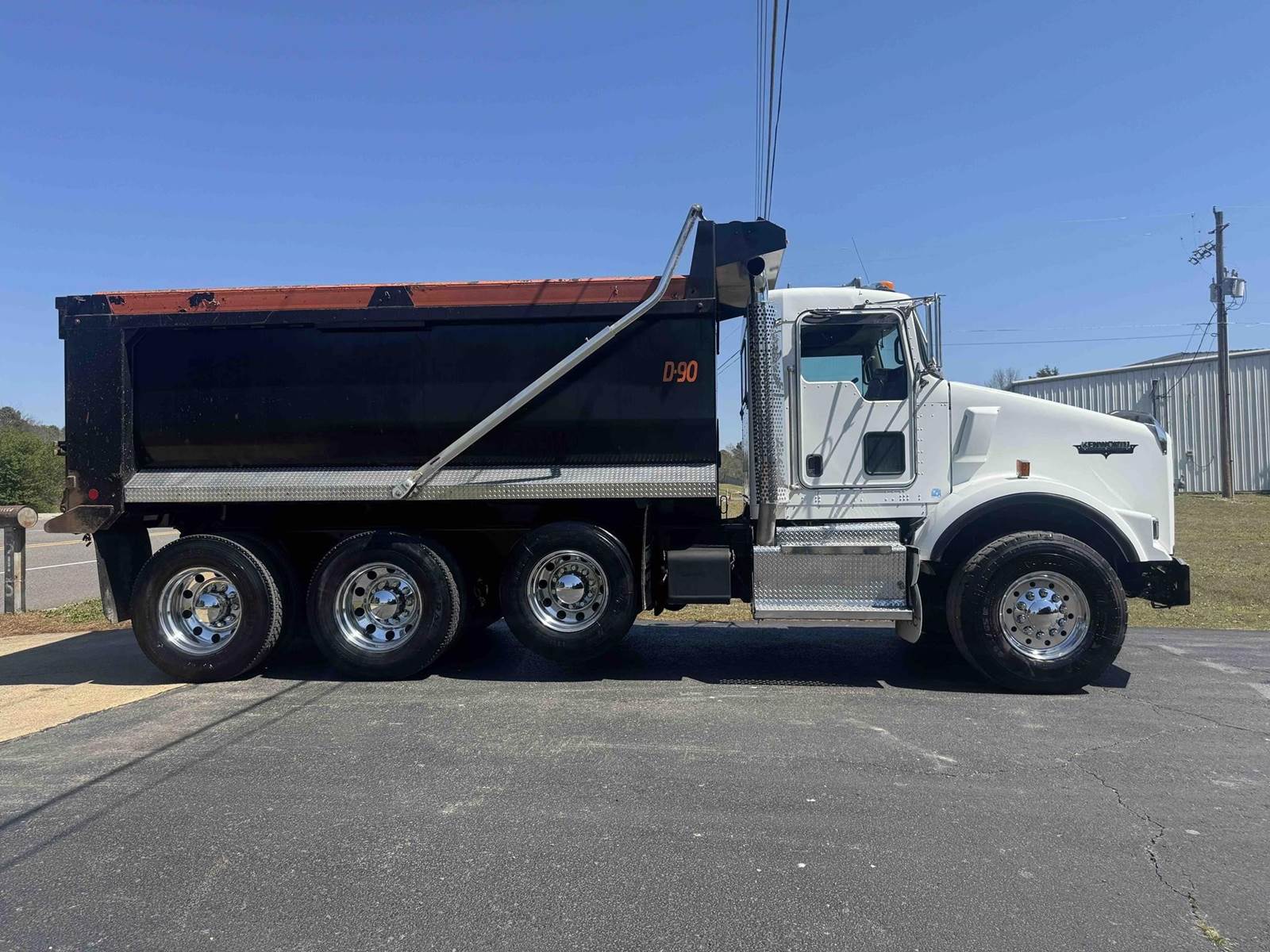 2016 KENWORTH T800 TRI-AXLE FACTORY DUMP TRUCK, 382,496 VERIFIED MILES, CUMMINS ISX-15 450, DELETED AND TUNED TO 500HP, EATON 8LL TRANSMISSION, ENGINE BRAKE, 20,000 LB FRONT AXLE, 22,500 LB PUSHER AXLE, 46,000 LB REAR AXLES, CHALMERS SUSPENSION, FULL LOCKING REARS, DOUBLE FRAME, DUAL POWER STEERING BOXES, ROGERS 16 FOOT MILLENNIUM AR450 STEEL BODY, 24.5 DRIVE TIRES WITH 425/65/R22.5 STEER TIRES, WITH ALL ALUMINUM WHEELS.