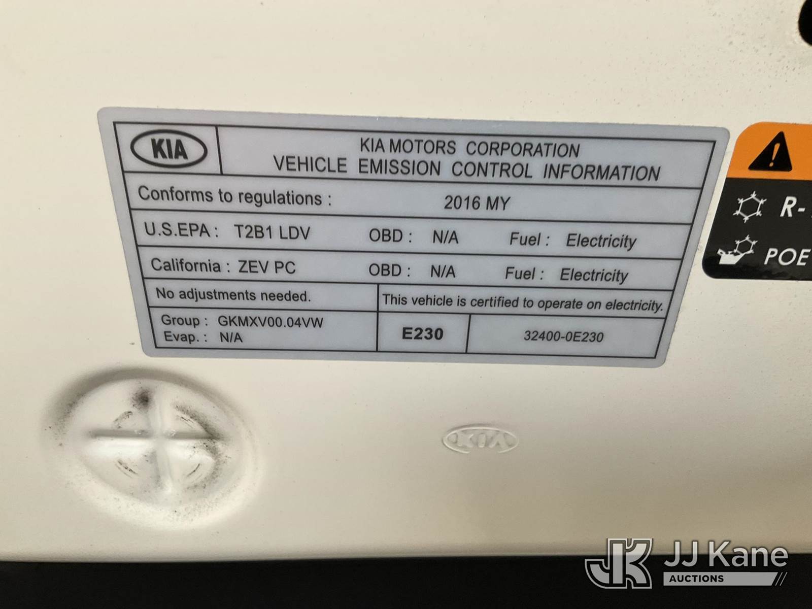 2016 Kia Soul EV 4-Door Sport Utility Vehicle, ELECTRIC, 1-Speed Automatic, A/C, (31,531 miles) (Runs & Moves) (Takes Charge, Charger Included In ML Office Tagged) This is a Titled Item NOTE: This unit is being sold AS IS/WHERE IS via Timed Auction and is located in Jurupa Valley, CA. Inspection & preview days for this unit are the 2 business days prior to the first day of items closing for this auction, item is located at 4510 Muth Way Jurupa Valley, CA 92509 and hours of operations are 8a-4p. For pre-sale questions, please contact please contact Office Staff @ (310) 353-7140. Dealer License Number 45696. (Buyer is responsible for removal. Assistance by consignor or JJ Kane Auctions is not assured.)