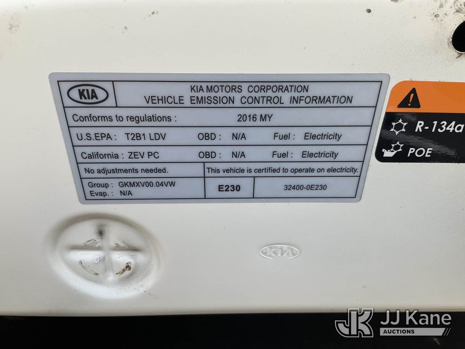 2016 Kia Soul EV 4-Door Sport Utility Vehicle, ELECTRIC, 1-Speed Automatic, A/C, (33,290 miles) (Runs & Moves) (Takes Charge, Charger Included) This is a Titled Item NOTE: This unit is being sold AS IS/WHERE IS via Timed Auction and is located in Jurupa Valley, CA. Inspection & preview days for this unit are the 2 business days prior to the first day of items closing for this auction, item is located at 4510 Muth Way Jurupa Valley, CA 92509 and hours of operations are 8a-4p. For pre-sale questions, please contact please contact Office Staff @ (310) 353-7140. Dealer License Number 45696. (Buyer is responsible for removal. Assistance by consignor or JJ Kane Auctions is not assured.)
