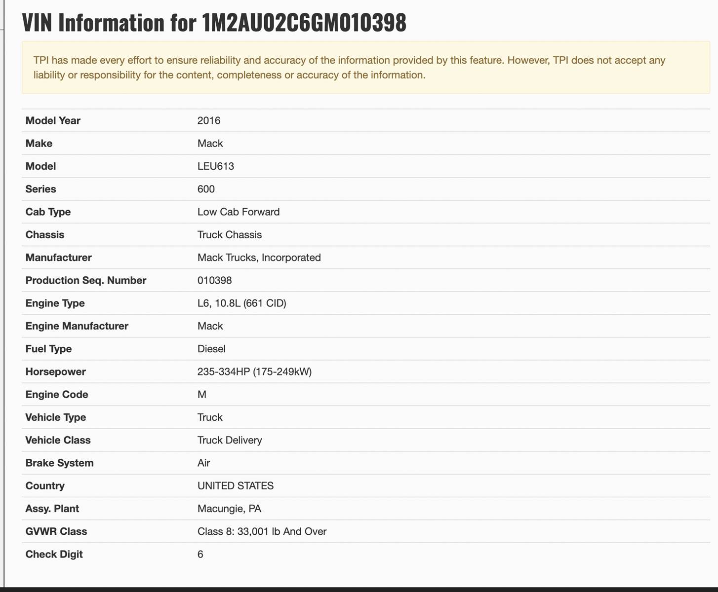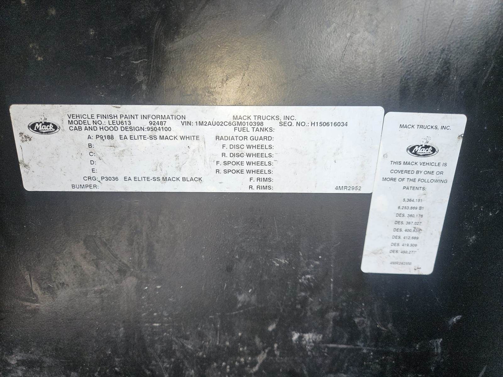 (USED / REPAIRABLE) 2016 MACK LEU613 FORWARD LOW CAB 600-SERIES FOR SALE, TRUCK CHASSIS, VIN: 1M2AU02C6GM010398, GVWR Class: 8: 33,001 LBS AND OVER, Stock # 9301 **COMES AS SEEN IN PHOTOS**, OFF DELIVERY TRUCK W/ MACK MP7 10.8L DIESEL ENGINE w/ AIR BRAKE SYSTEM, ** FRONT AXLE, OR DIESEL ENGINE NOT INCLUDED***