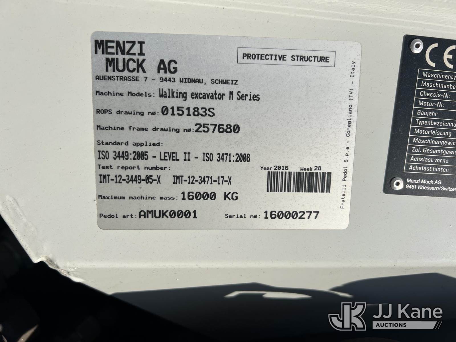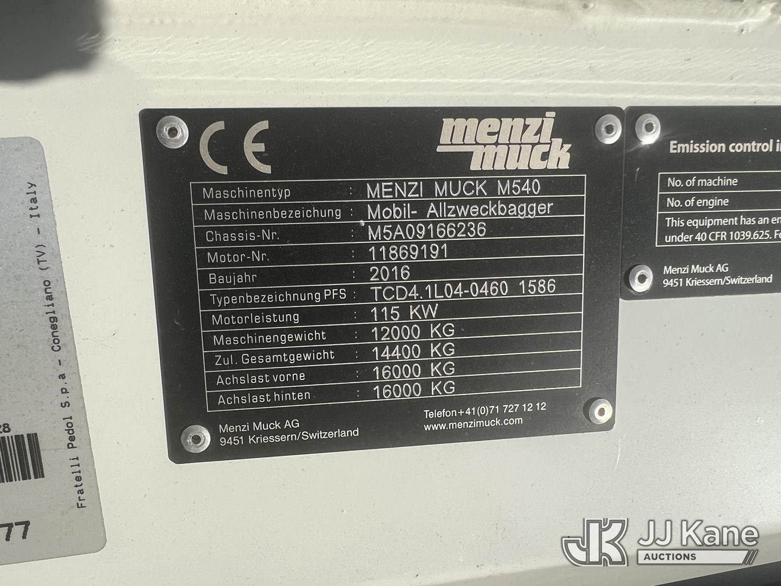 2016 Menzi Muck M540 Spider Excavator, s/n M5A09166236, Deutz diesel, Hydraulic Drive, with 56 in. tilting cleanout bucket, telescopic boom, aux hyd & EROPS w/A/C, (Runs, Moves & Operates) (Reads 87 hours) NOTE: This unit is being sold AS IS/WHERE IS via Timed Auction and is located in Villa Rica, GA. Inspection & preview days for this unit are the 2 business days prior to the first day of items closing for this auction, item is located at 100 Liberty Rd Villa Rica, GA 30180 and hours of operations are 8a-4p. For pre-sale questions, please contact Office Staff @ (470) 590-8453. (Buyer is responsible for removal. Assistance by consignor or JJ Kane Auctions is not assured.)