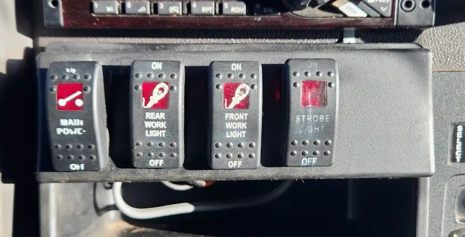 (Used) 2016 Peterbilt 337, MISCELLANEOUS DASH SWITCHES- Controls: Main Power, Rear Work Light, Front Work Light, Strobe Light, Material: Plastic, Reference images for condition, For more information about this item, give us a call. We ship Worldwide! (CRG HEAVY TRUCK PARTS) 929 W PULASKI HWY ELKTON, MD 21921, Material: Plastic