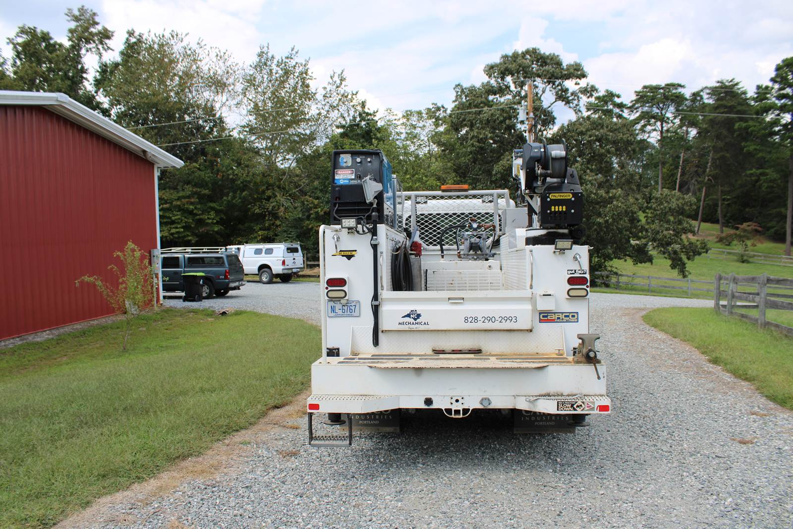Palfinger PCB72, 11’ crane body, 8,000 lb crane with wireless remote. Hydraulic air compressor, Miller welder. 32 gallon diesel transfer tank, 60 gallon waste oil tank with recovery system, 20 gallon fresh water tank. Compartments have one set of tool drawers, torch compartment, bolt bins, 4 drawer tool chest over rear axle. 50’ welding leads routed into the rear street side box. Brackets for chains and lifting equipment. Shelves in all compartments. Includes an arc gouging whip and a box of sticks. Inverter in the first box on the street side. Work lights at each of the corners of the bed and on the head ache rack. Yellow beacon light on the head ache rack.