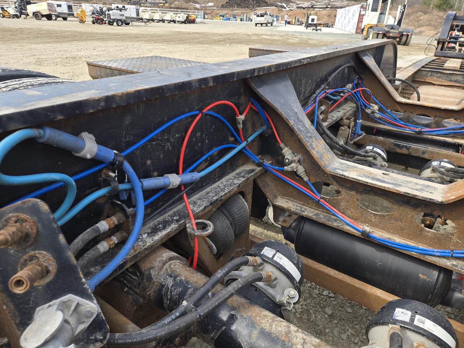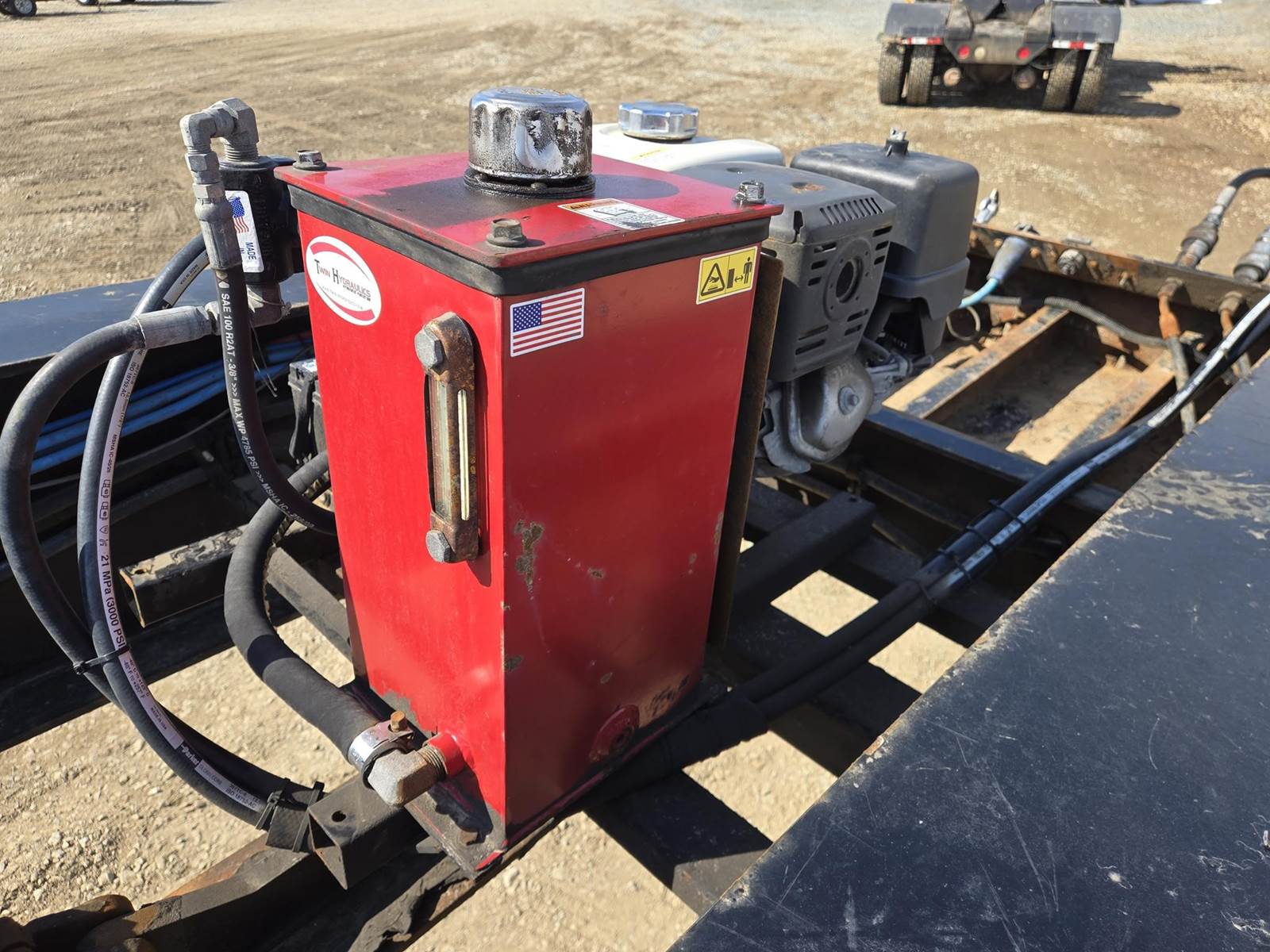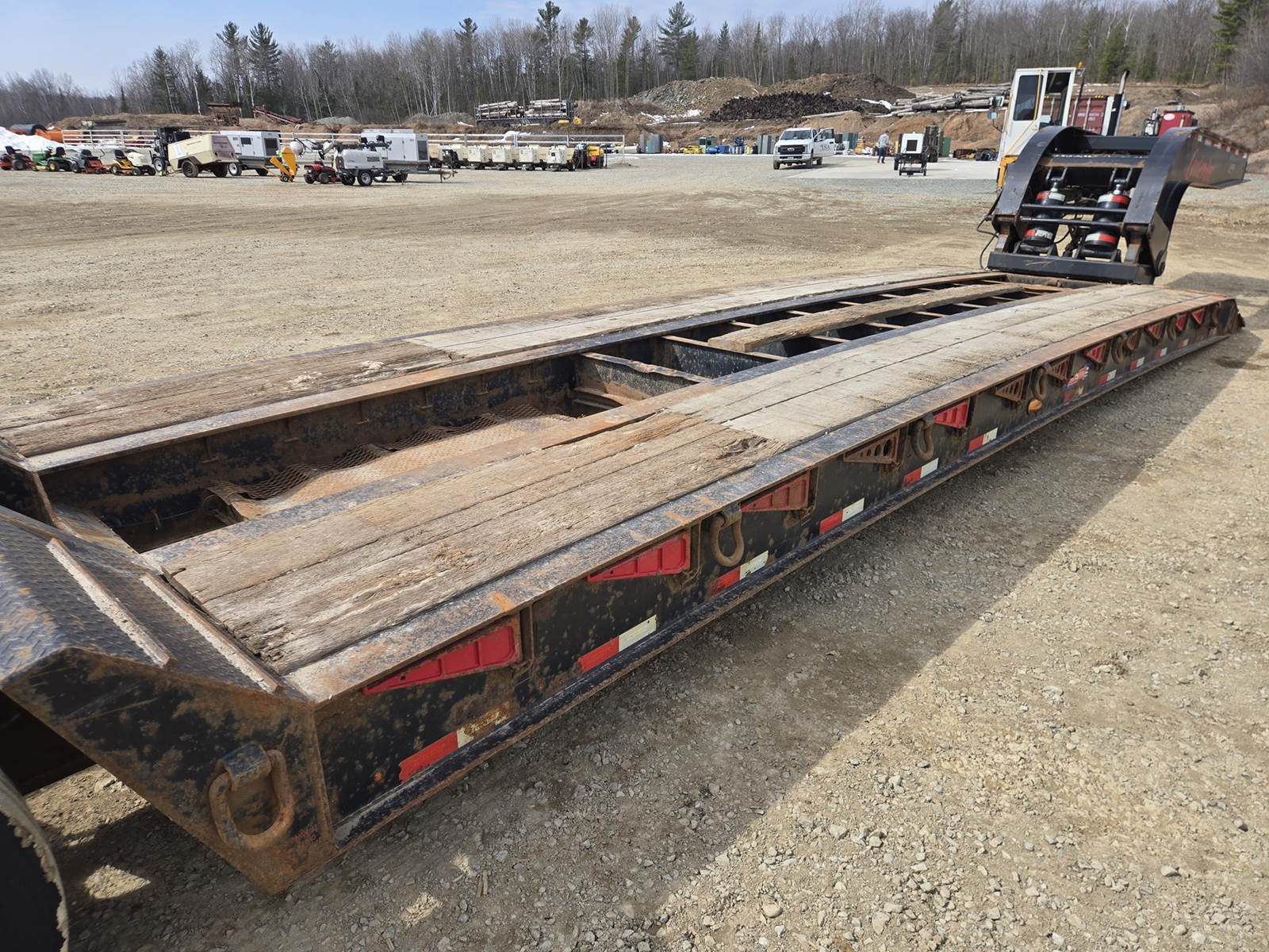 122500lb GVWR, Approx 102" Width, Air Ride Suspension, Rear Air Lift Axle, Approx 25' Well. Hydraulic Detach Neck, Honda GX 390 Gasoline Engine, D-Rings, 12" Deck Extensions, 275/70R22.5 Tires