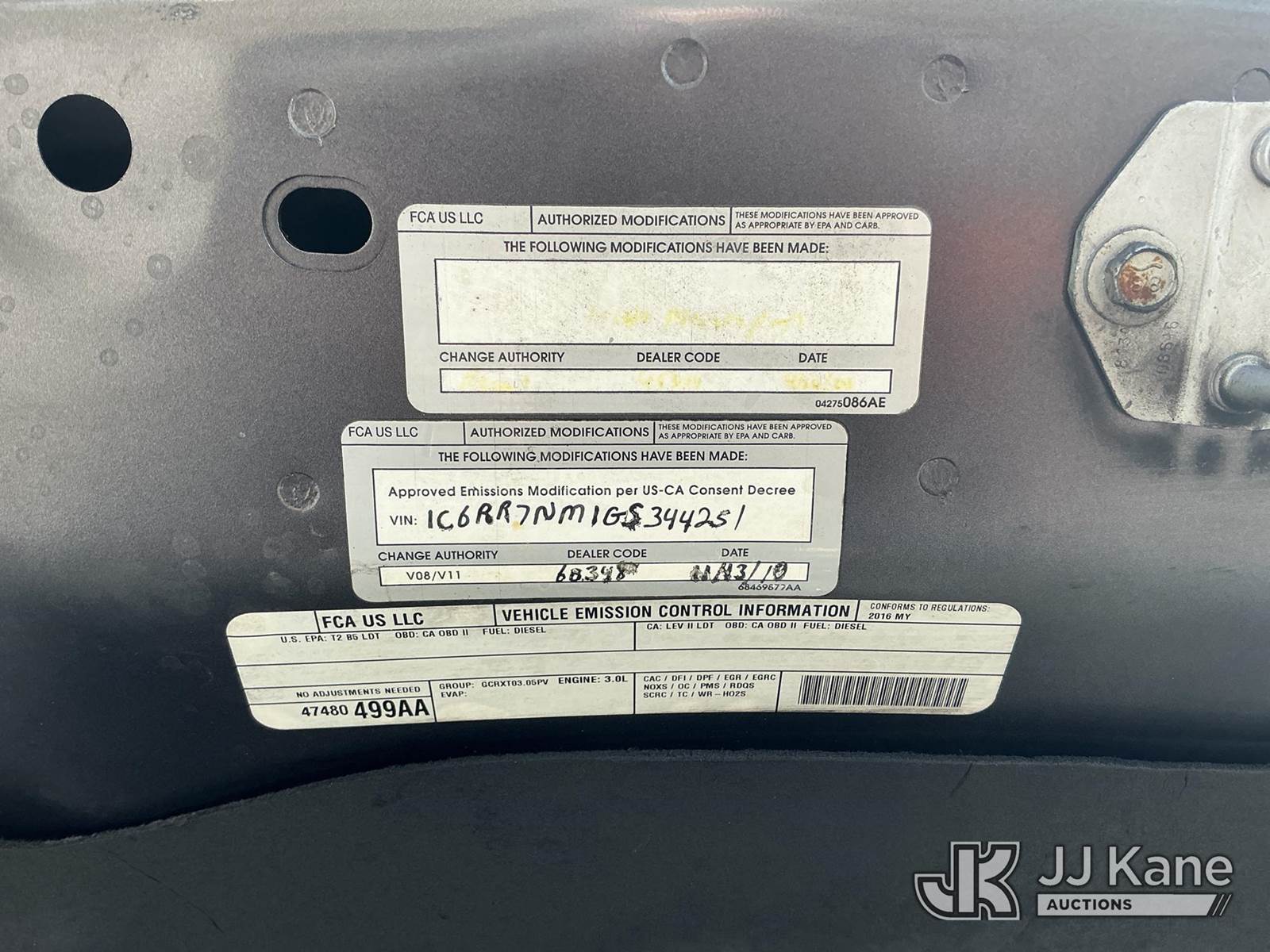2016 RAM 1500 4x4 Crew-Cab Pickup Truck, 3.0L DIESEL, 8-Speed Automatic, A/C, (151,293 miles) (Runs & Moves) (Jump To Start, ABS Light On, Traction Control Light On) (FL Residents Purchasing Titled Items - tax, title & registration fees will be collected at the maximum rate of $400.00 under 25,999 and $800.00 for Over 26,000 and $250.00 trailers - Proof of insurance is mandatory; Out of State Residents Purchasing Title Items - tax will be collected based upon your state rate.) This is a Titled Item NOTE: This unit is being sold AS IS/WHERE IS via Timed Auction and is located in Thonotosassa, FL. Inspection & preview days for this unit are the 2 business days prior to the first day of items closing for this auction, item is located at 11720 N US 301 Thonotosassa, Fl 33592 and hours of operations are 8a-4p. For pre-sale questions, please contact Office Staff @ (813) 986-2485. (Buyer is responsible for removal. Assistance by consignor or JJ Kane Auctions is not assured.)