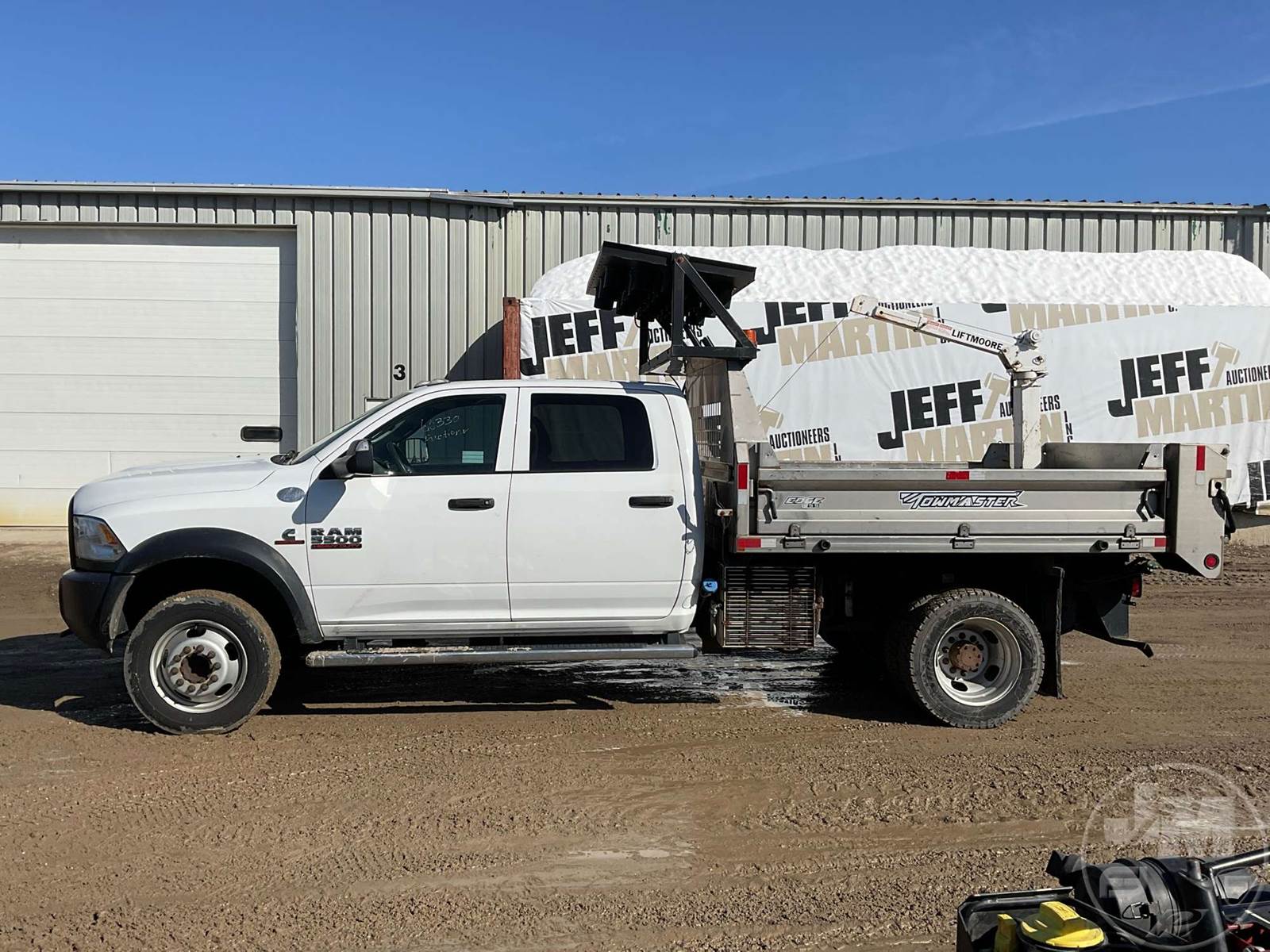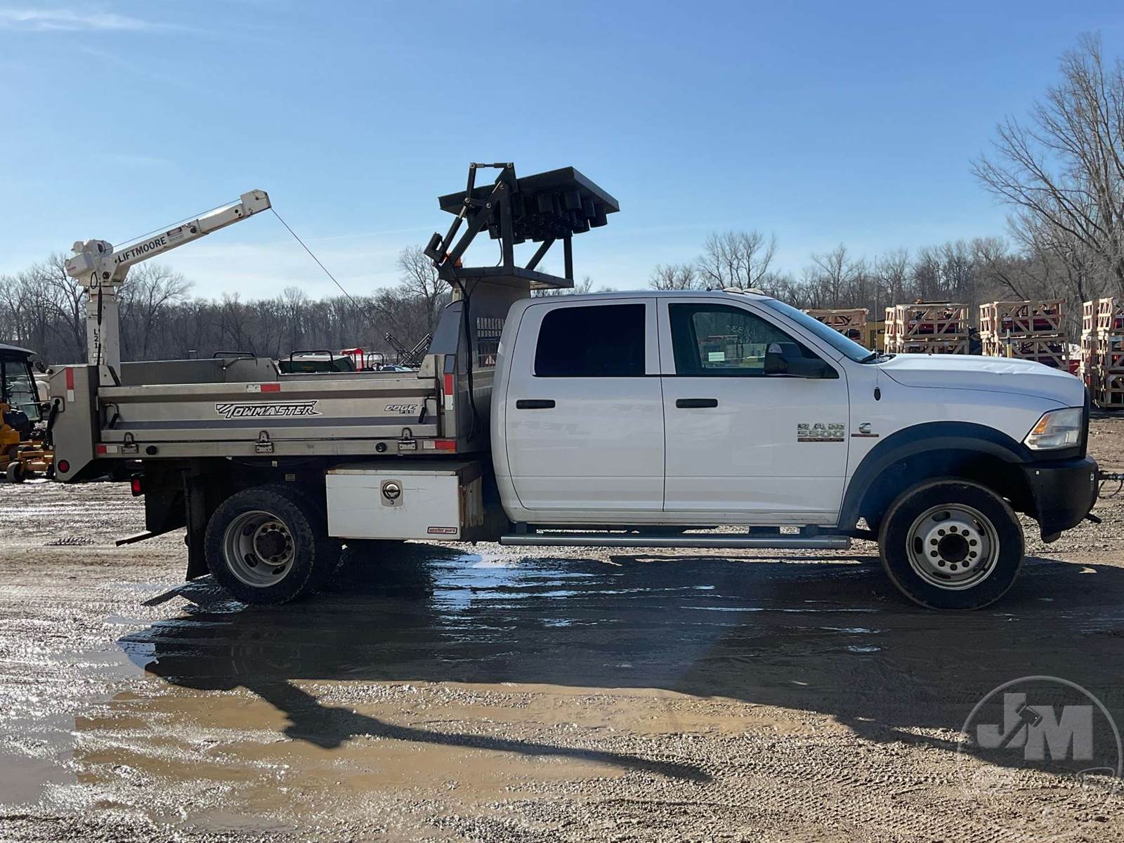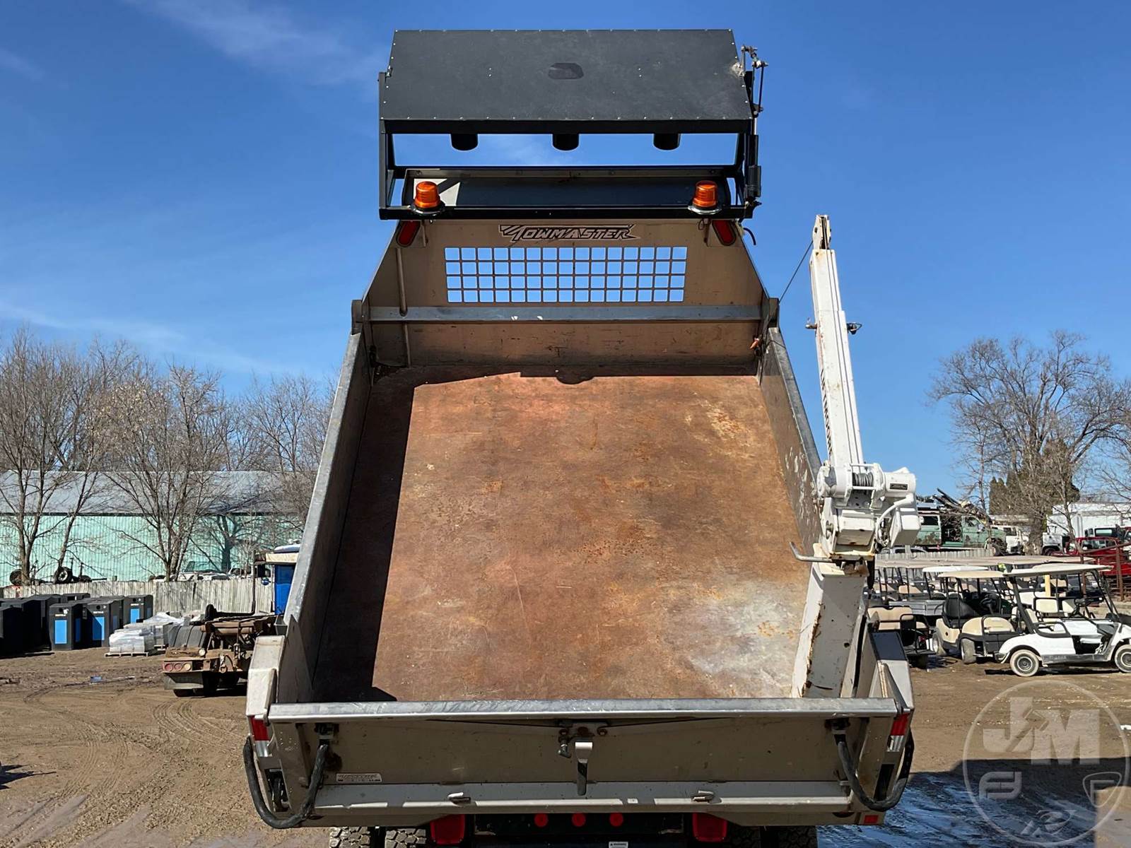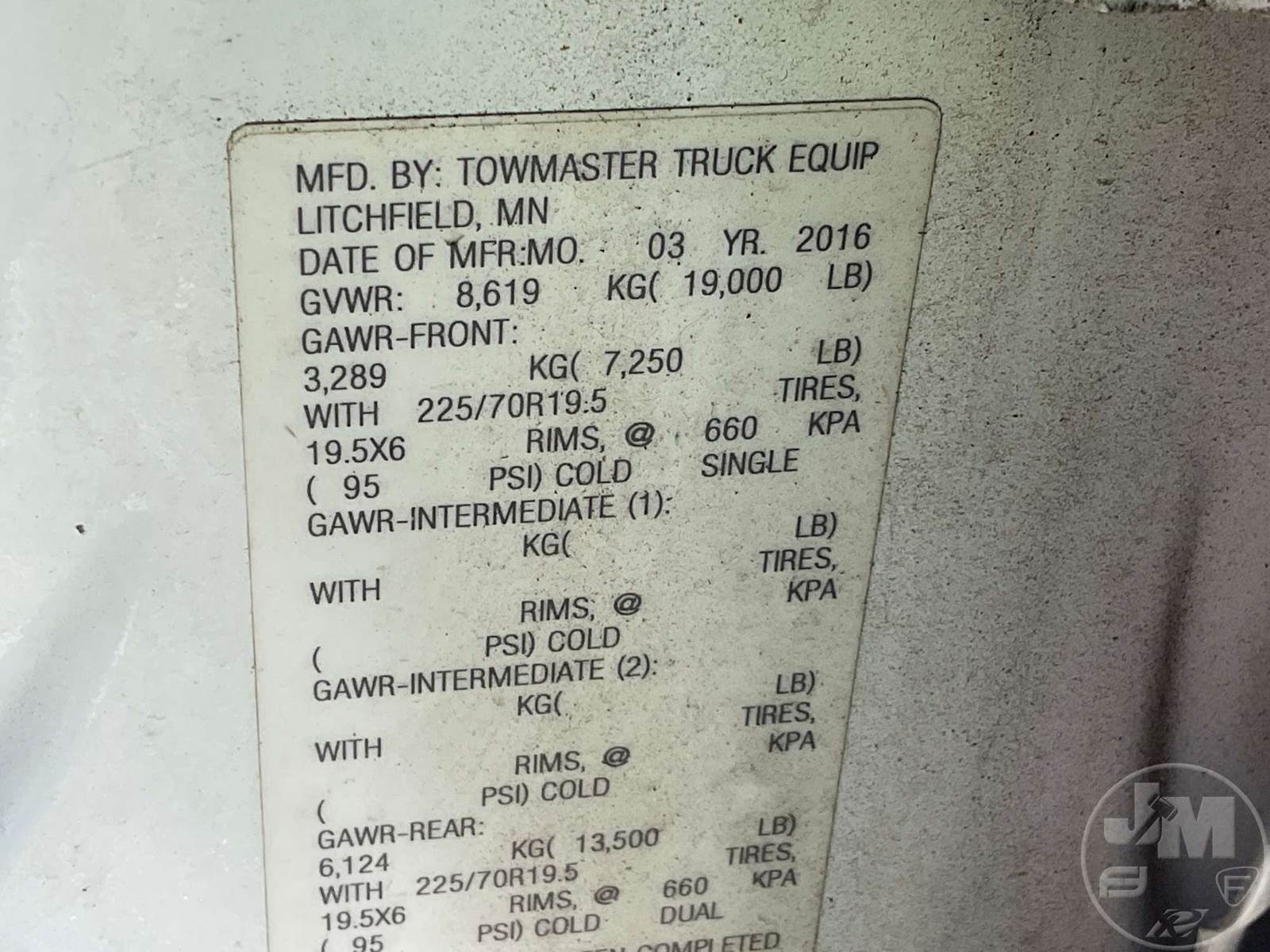 SINGLE AXLE DUMP TRUCK, CUMMINS, 6.7L, AUTOMATIC, HYDRAULIC BRAKES, SPRING SUSPENSION, 174 " WB, ENGINE BRAKE, CRUISE CONTROL, PINTLE HITCH, A/C, POWER WINDOWS, POWER DOOR LOCKS, POWER MIRRORS, MANUAL GATE, 19K GVWR, STEEL DISC WHEELS, 225/70R19.5 TIRES, CREW CAB, VANAIR COMPRESSOR & PTO INSTALLED, INCLUDES LIFTMOORE 2000 LBS CRANE W/ 7' REACH, FRONT GAWR 7,250 LBS - REAR GAWR 13,500 LBS, TOWMASTER 9.5' STAINLESS STEEL DUMP BODY, TOP MOUNTED TRAFFIC DIRECTOR SIGN, ***CHECK ENGINE LIGHT***, HOUR METER READS: 9688, ODOMETER READS: 74759, *** GOVERNMENT OWNED 10% UNCAPPED PREMIUM***