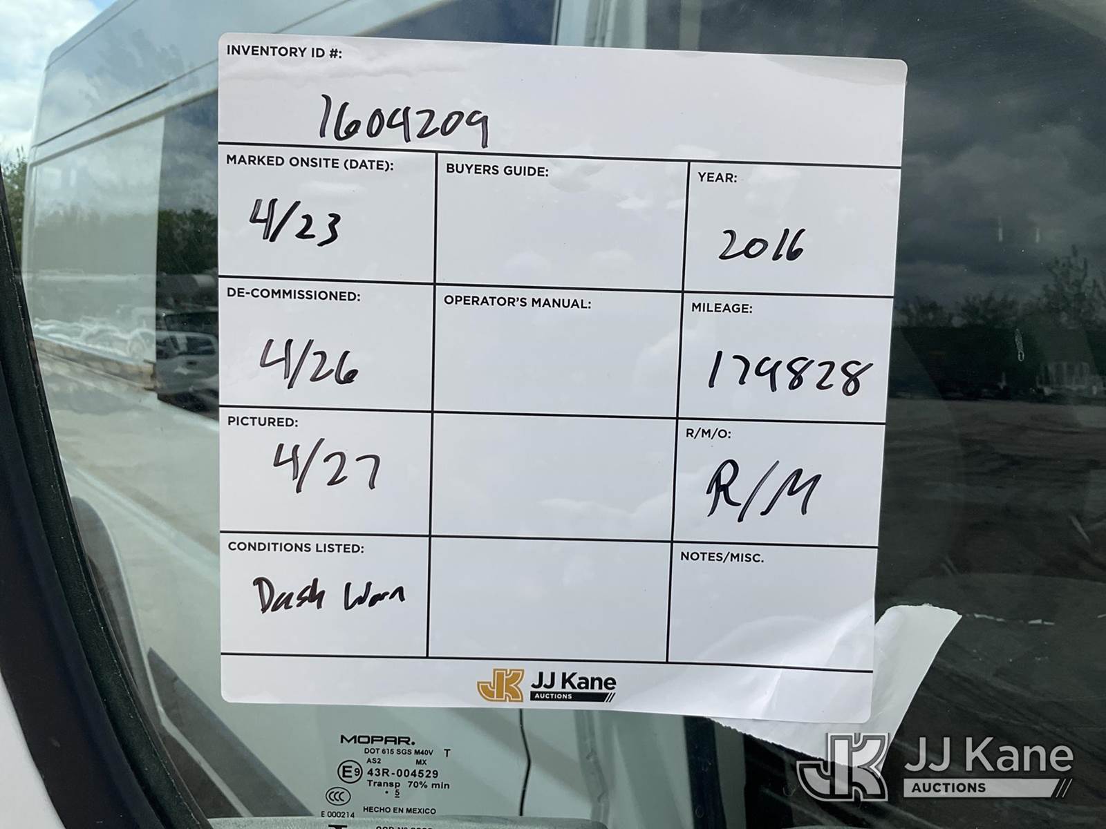 2016 RAM Promaster 2500 High Roof Sprinter Cargo Van, 6-cyl FWD, Gas, Auto, A/C, (179,828 miles) ((Runs & Moves) (Engine Won’t Stay Running Without a Battery Pack, Dash Warning Indicator On, Exterior Defects - Could Not Open Sliding Door)) This is a Titled Item NOTE: This unit is being sold AS IS/WHERE IS via Timed Auction and is located in Des Moines, IA. Inspection & preview days for this unit are the 2 business days prior to the first day of items closing for this auction, item is located at 1600 NE 66th Ave Des Moines, IA 50313 and hours of operations are 8a-4p. For pre-sale questions, please contact Eric Stewart @ (515) 626-0492. (Buyer is responsible for removal. Assistance by consignor or JJ Kane Auctions is not assured.)