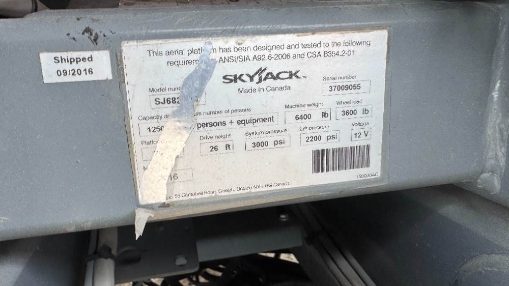 2016 SKYJACK SJ6826RT ROUGH TERRAIN SCISSORLIFT, Kubota diesel, 26' lift, 4x4, extendable platform, foam filled tires, 1,120 hours indicated. s/n:37009055