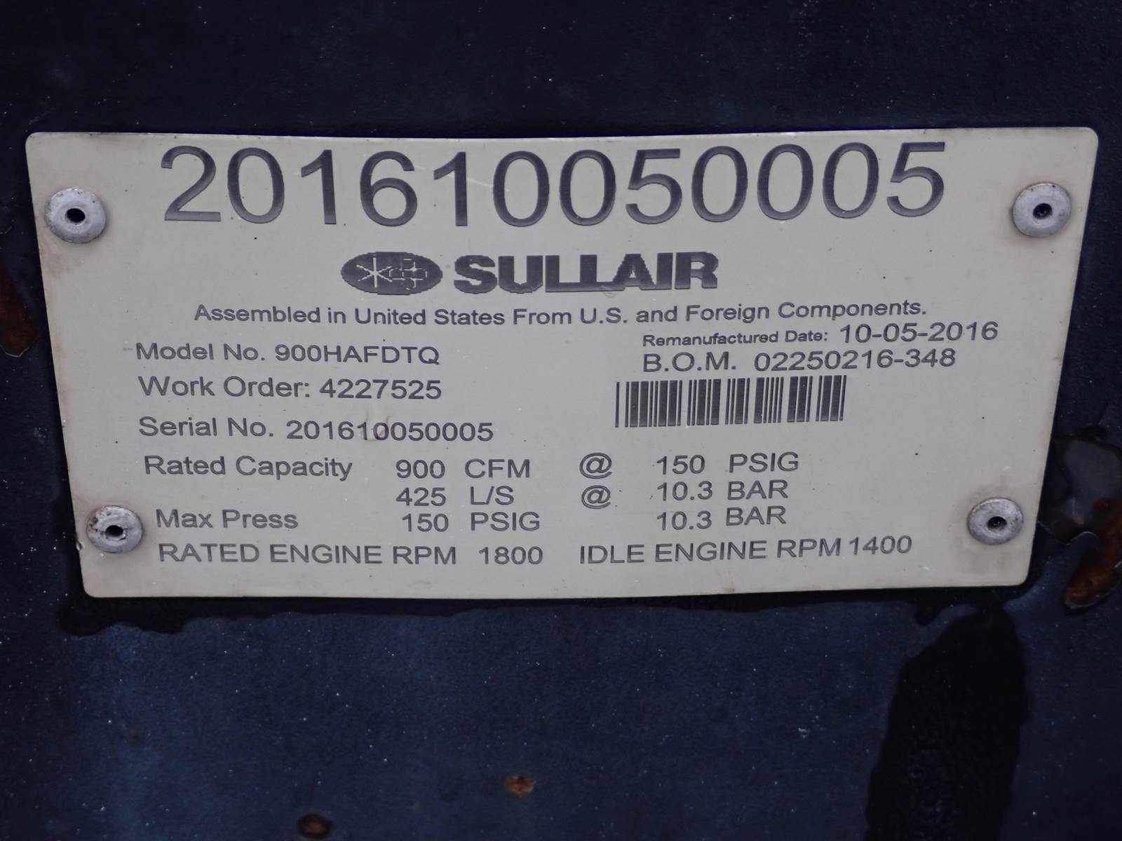 2016 Sullair 900HAFDTQ 900 CFM Air Compressor