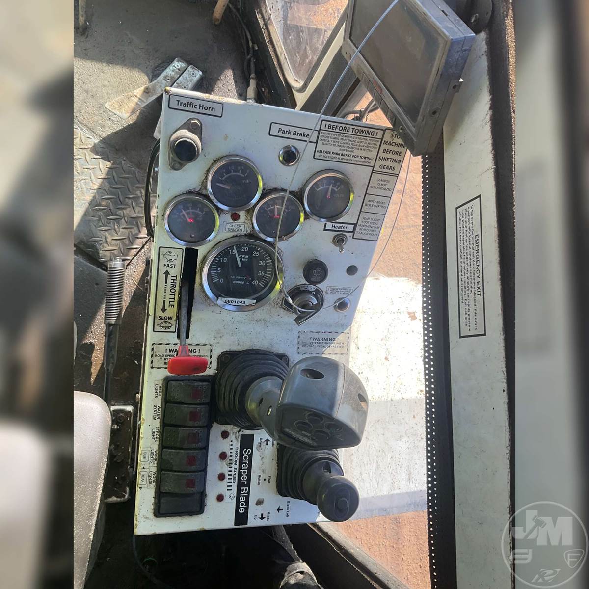 BROOM, CAB, A/C, WATER SYSTEM, 8' BROOM, DEERE, 4 CYL ENGINE, 4-WAY PUSH BLADE, HOUR METER READS: 3264